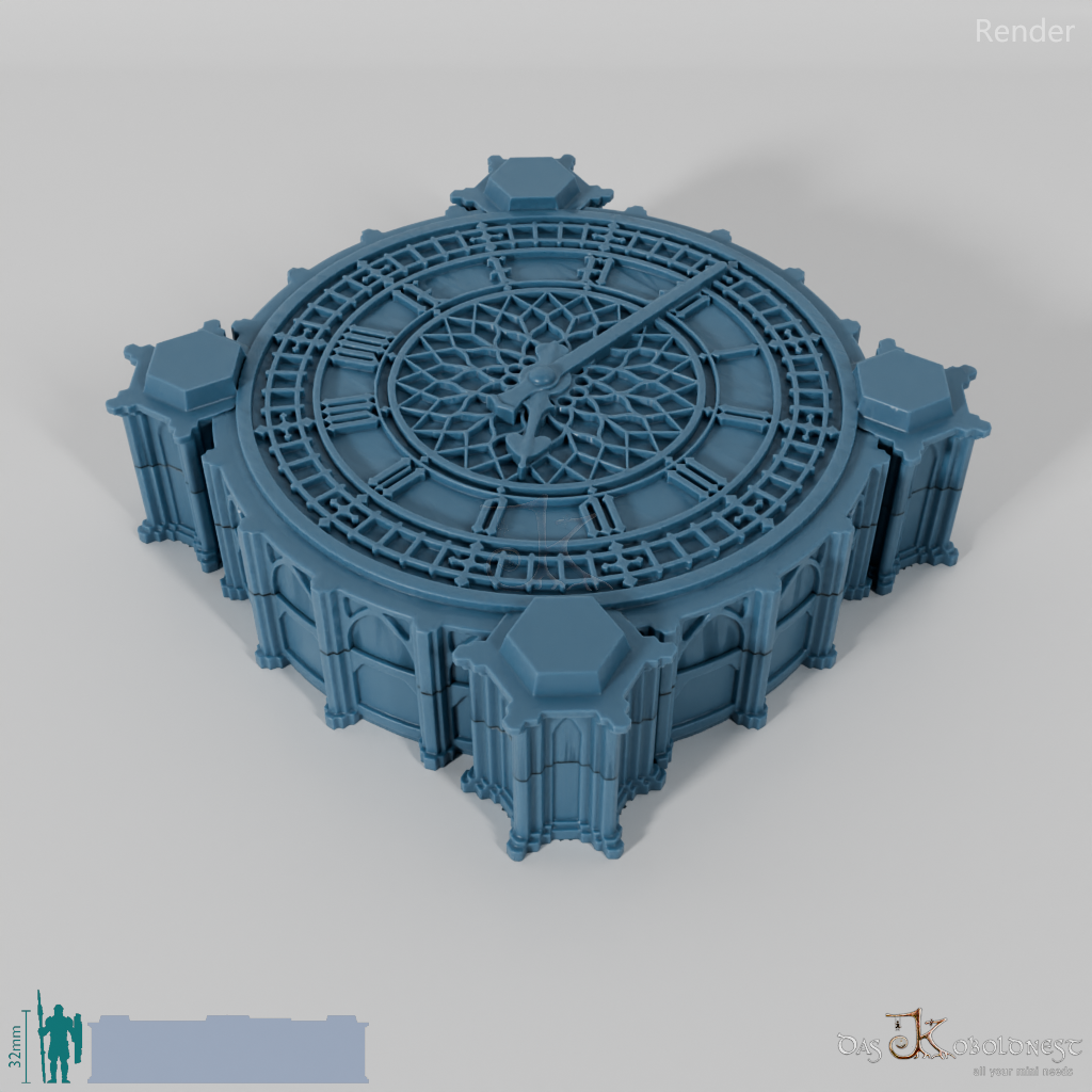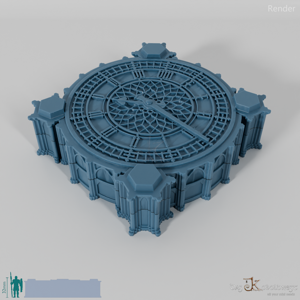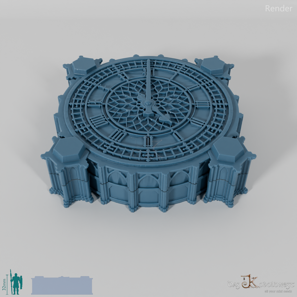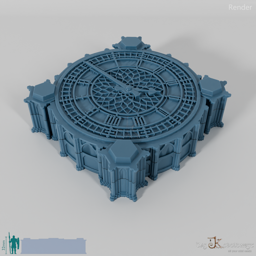 Verzierte Aufbewahrungsbox für sieben Würfel die wie eine alte Uhr gestaltet ist.