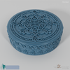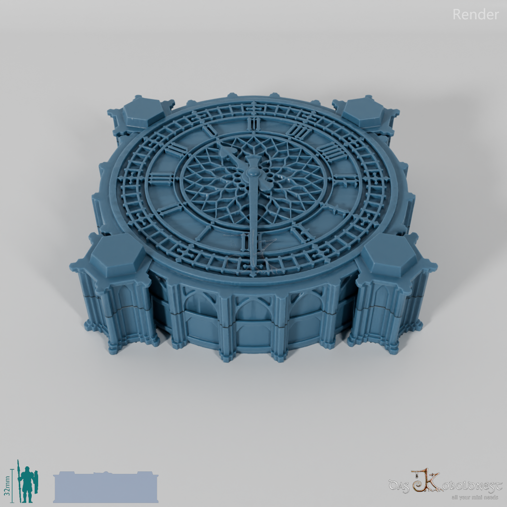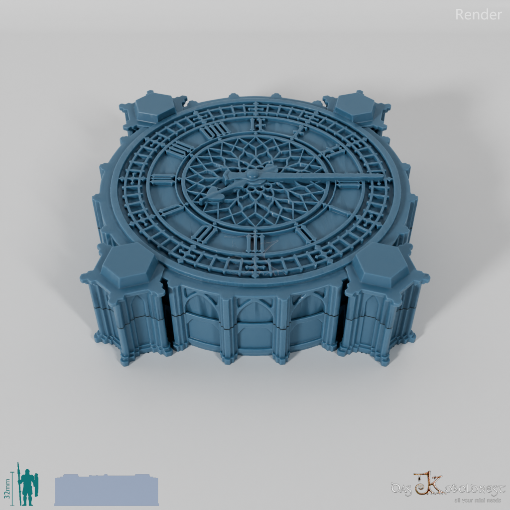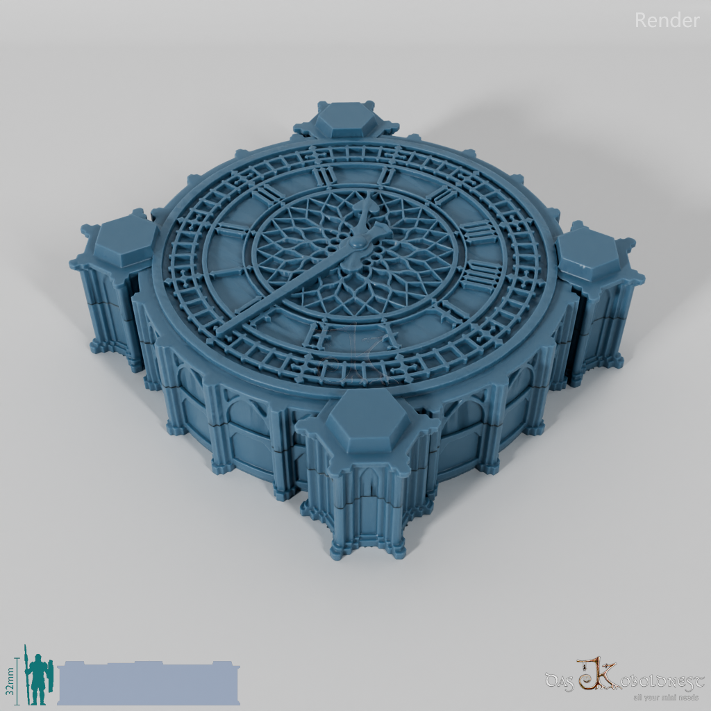 Verzierte Aufbewahrungsbox für sieben Würfel die wie eine alte Uhr gestaltet ist.