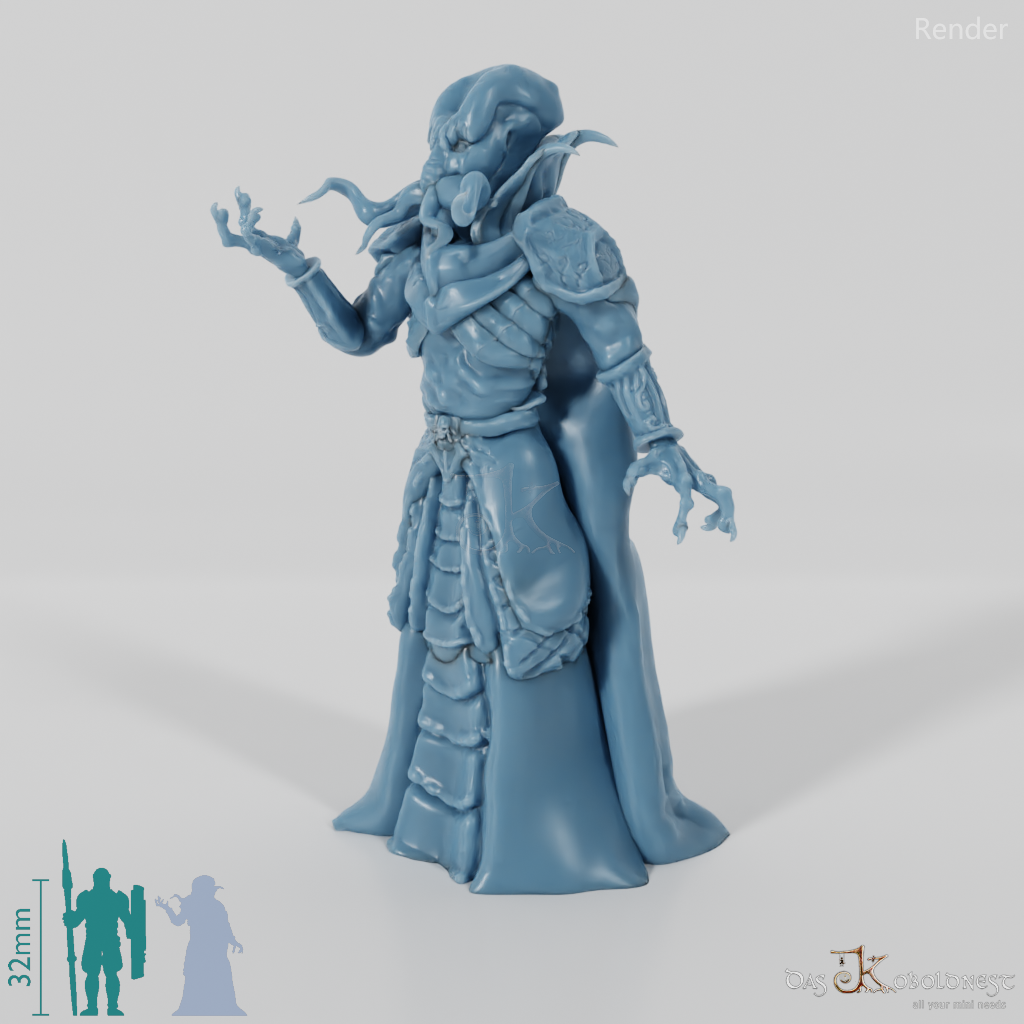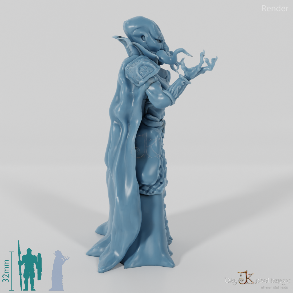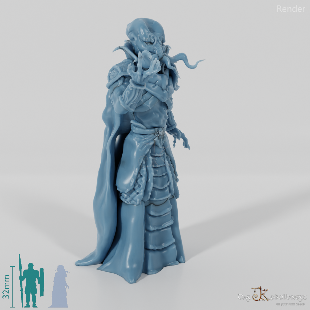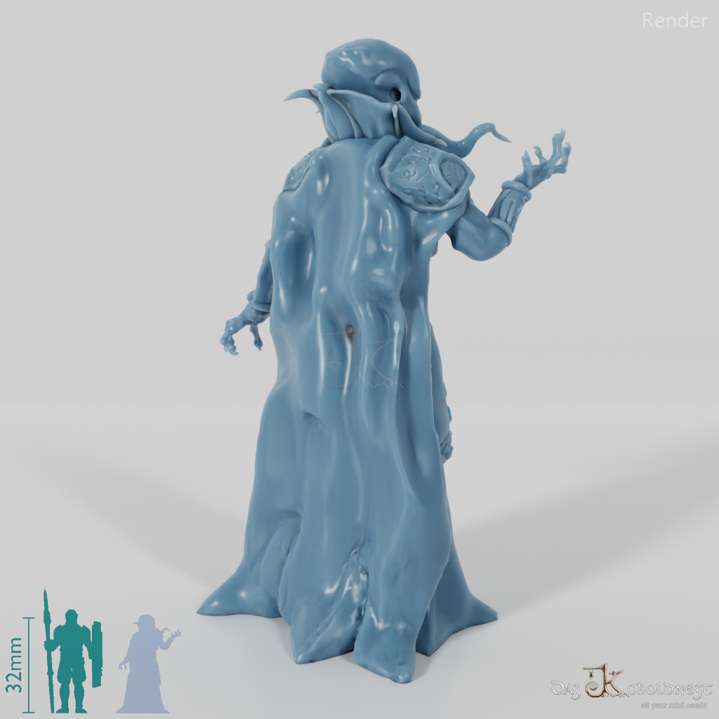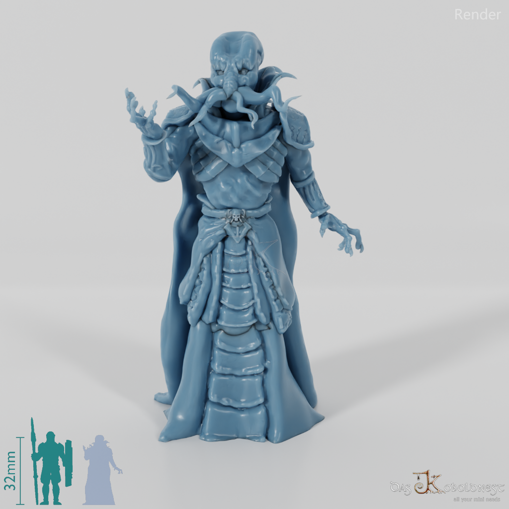 Humanoides Wesen mit tintenfischartigem Kopf und Tentakeln im Gesicht Modell: Mindflayer by jgsculpts, lizenziert unter CC BY 3.0.