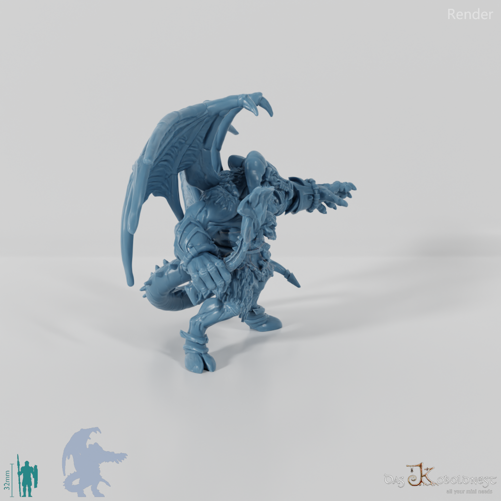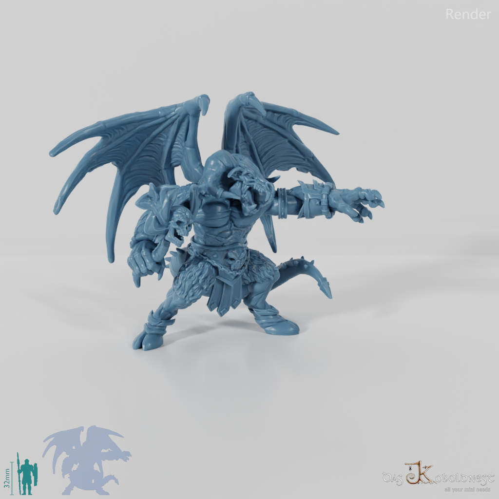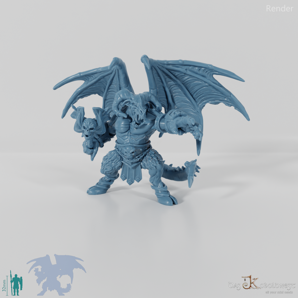 Gehörnter Dämon mit Ziegenhufen, Schädelszepter in einer Hand