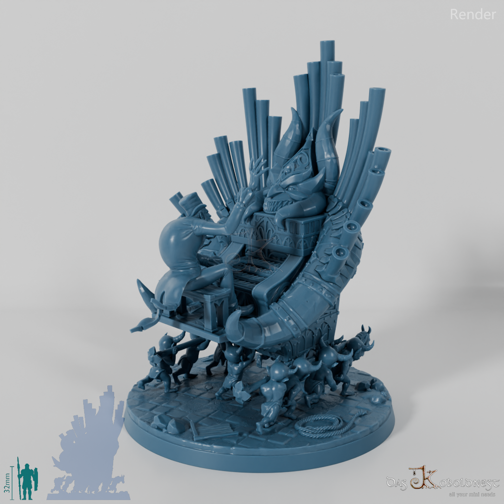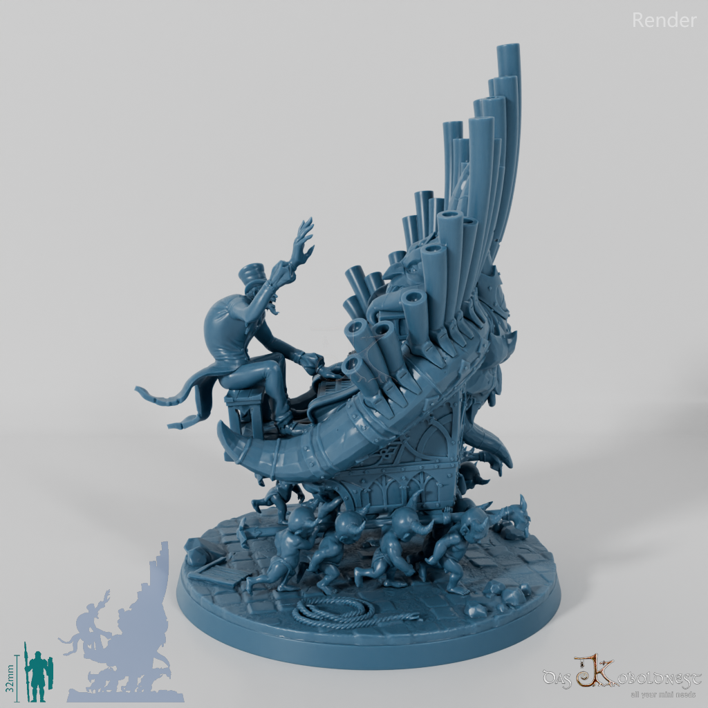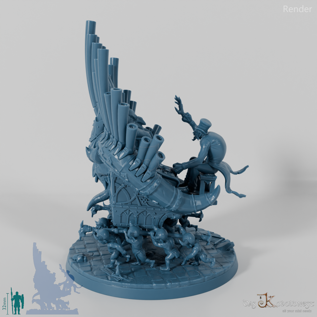 Mann mit Buckel und unnatürlich langen Armen, der auf einer von kleinen Teufeln getragenen Orgel mit Teufelskopf sitzt und sein Instrument spielt.