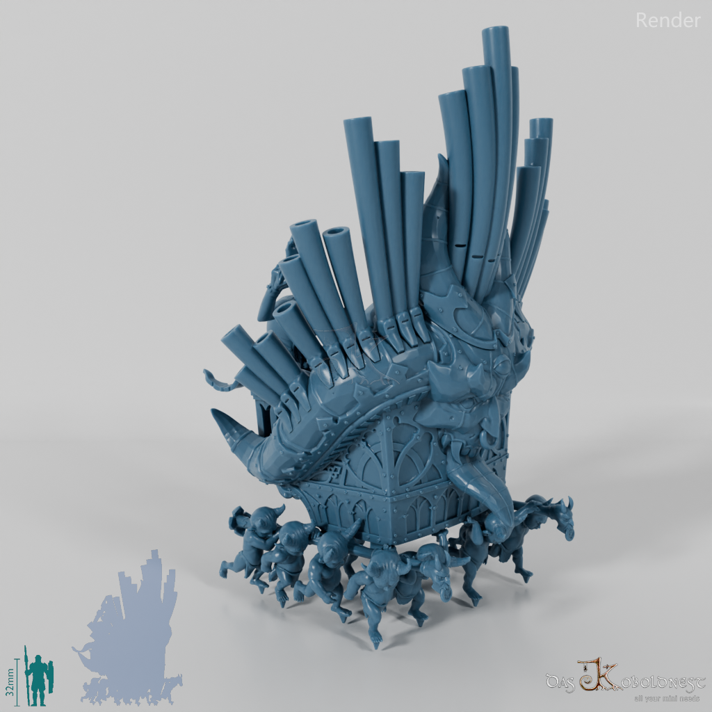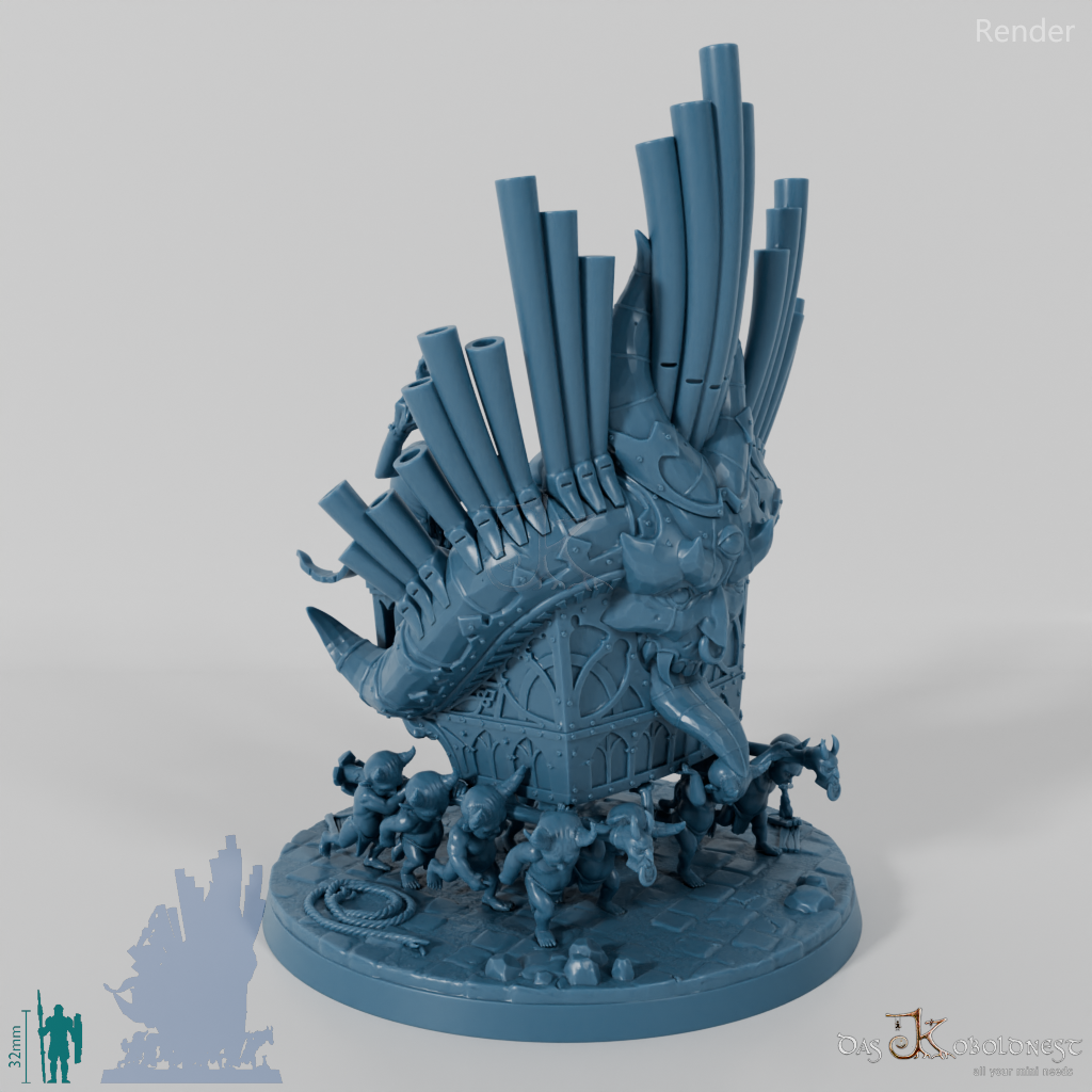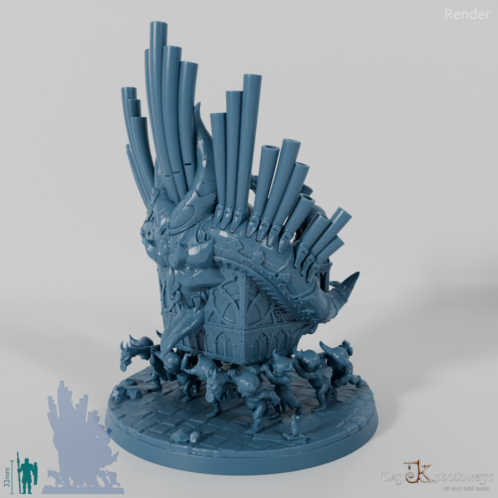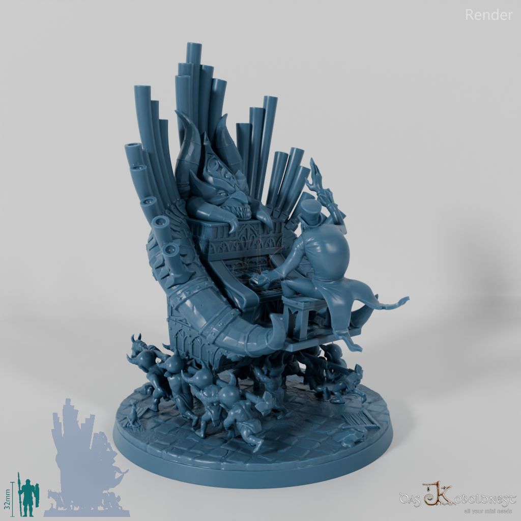 Mann mit Buckel und unnatürlich langen Armen, der auf einer von kleinen Teufeln getragenen Orgel mit Teufelskopf sitzt und sein Instrument spielt.
