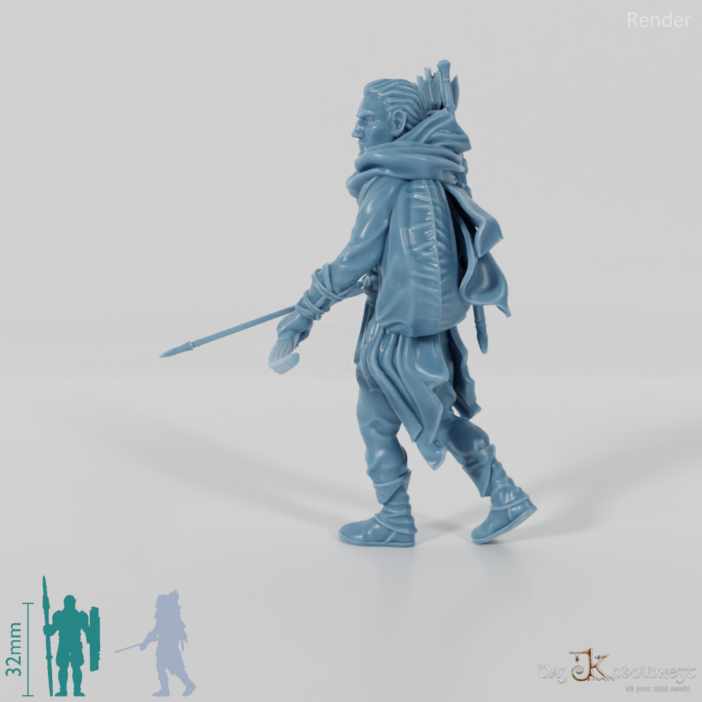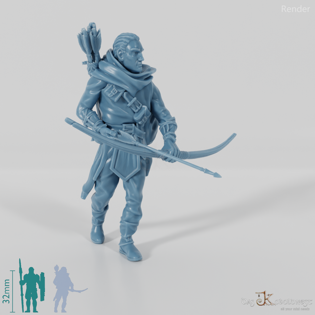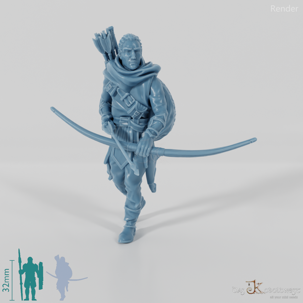 Bogenschütze in Stoffkleidung, der mit einem Bogen bewaffnet ist