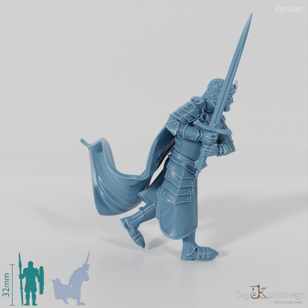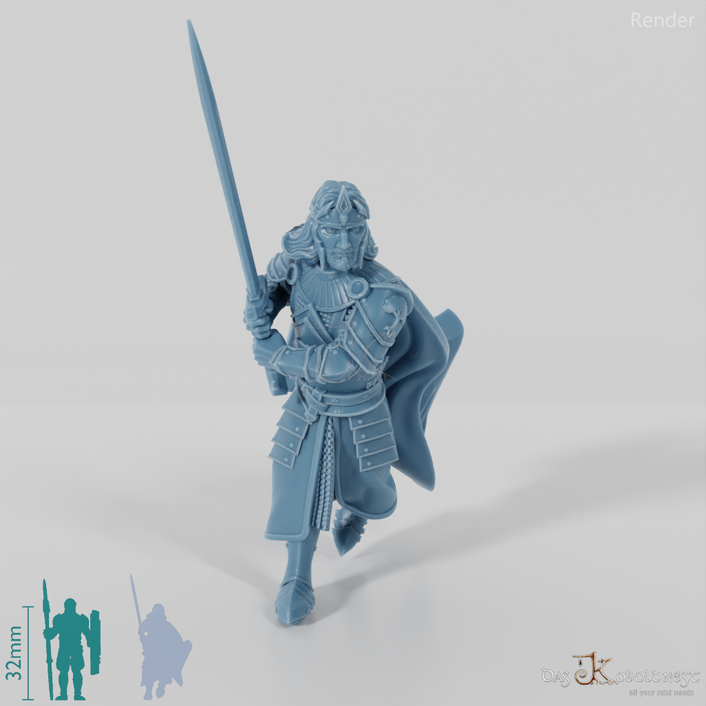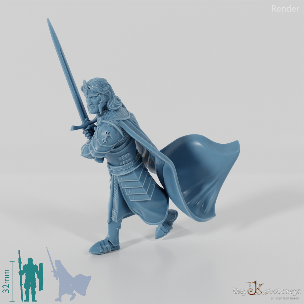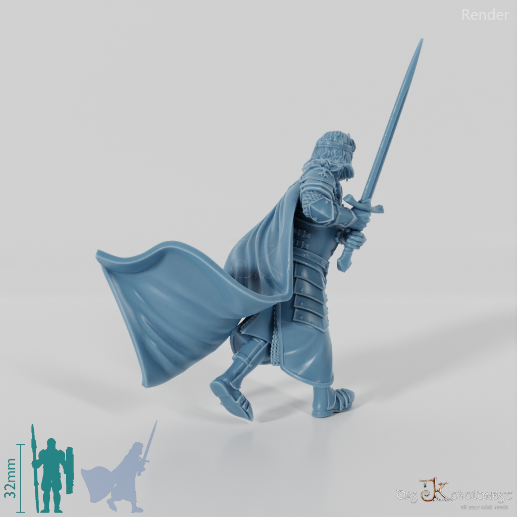 Aranglor, der erhabene König der vereinten Menschen, verkörpert die Einheit und Stärke seiner Leute. Mit seinem unerschütterlichen Blick, der jeden Gegner in die Knie zwingt, schreitet er gemessenen Schrittes und mit wehendem Umhang in die Schlacht. Jeder Aspekt seiner Erscheinung, von der kunstvoll verzierten Rüstung mit dem prägnanten Baumemblem bis hin zu der majestätischen Krone, die sein wehendes Haar krönt, spricht von königlicher Würde und Tapferkeit. Das mit beiden Händen erhobene Schwert ist ein Zeichen seiner Entschlossenheit und Führungsstärke.