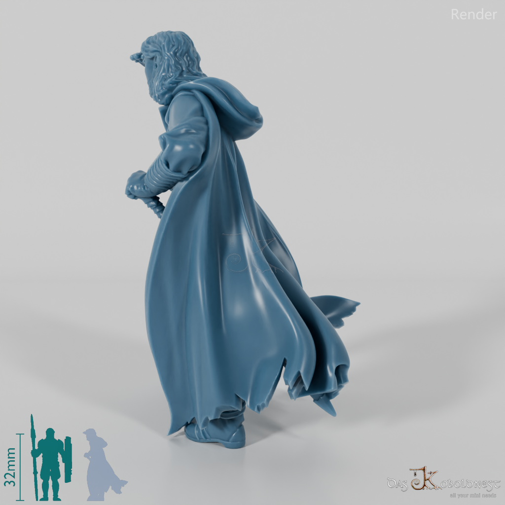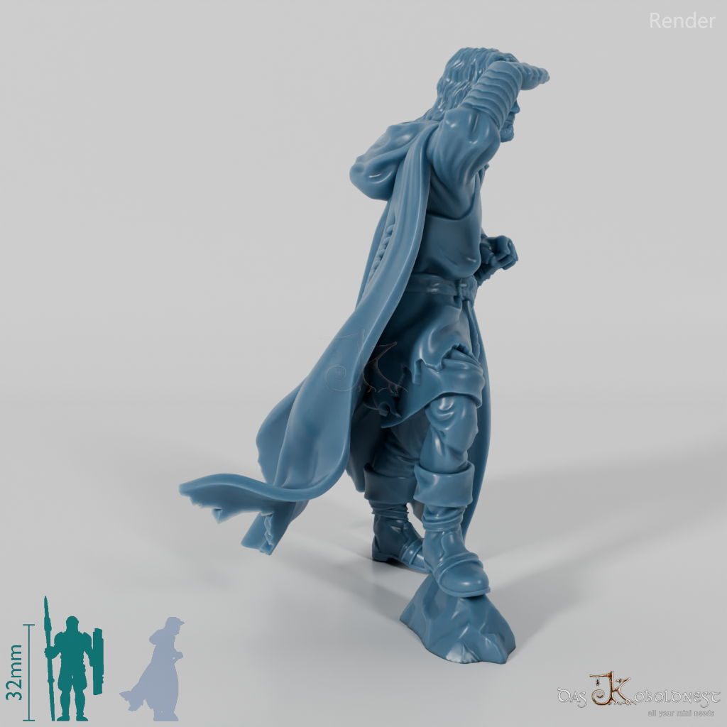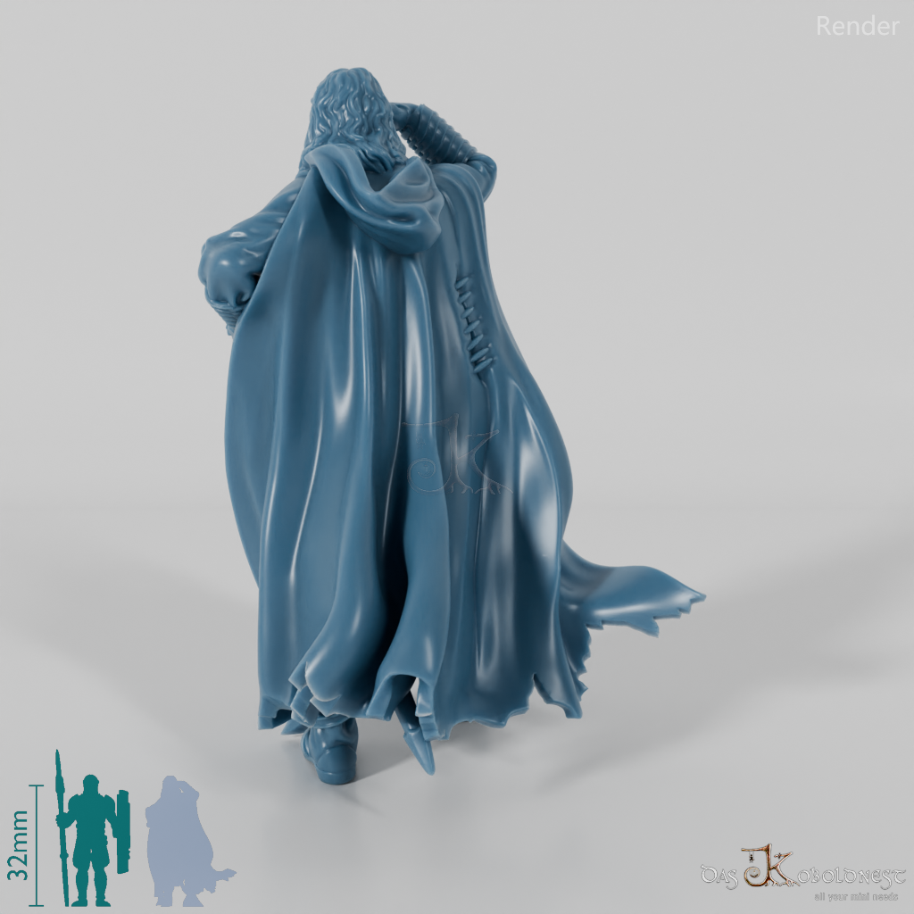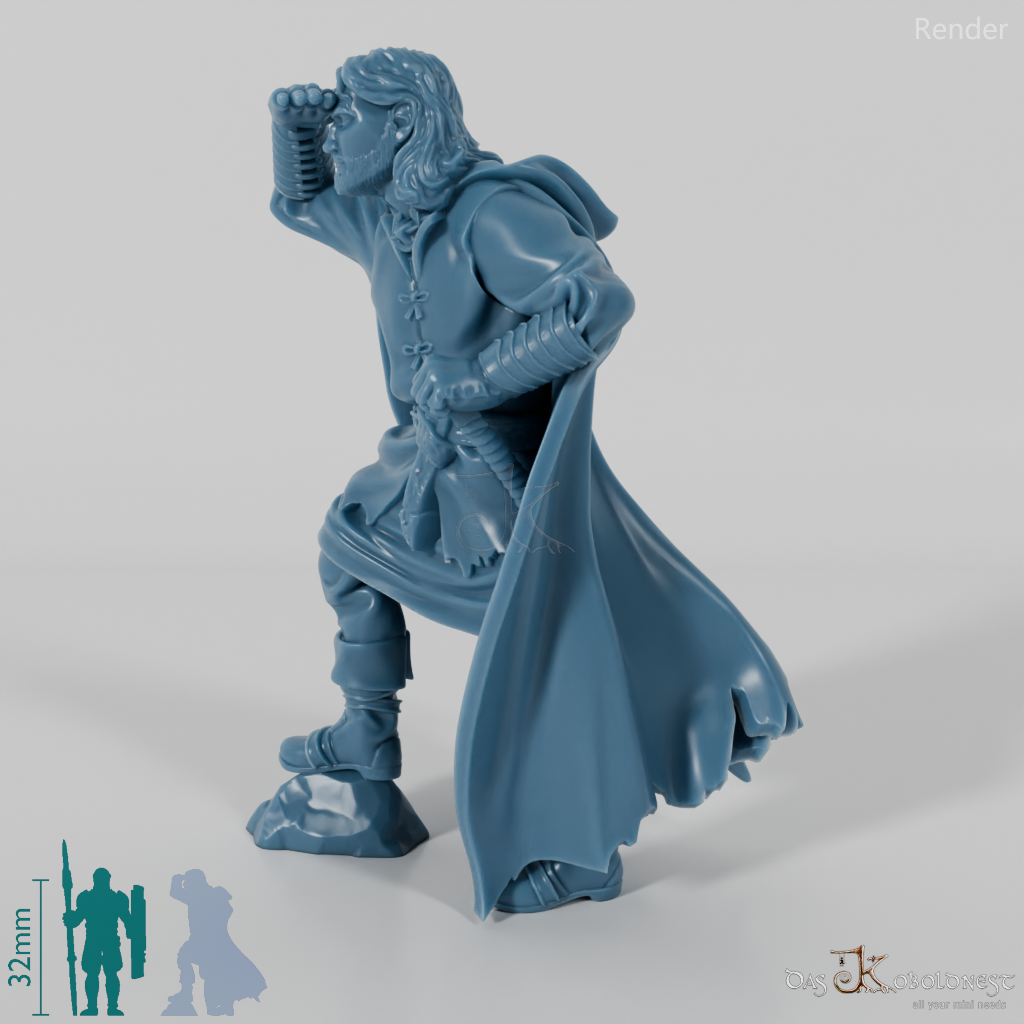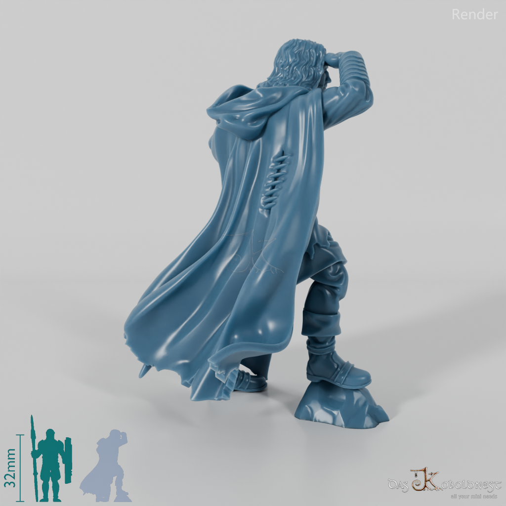 Mit Schwert bewaffneter Waldläufer mit Umhang, der in die Ferne Blickt. Dies ist eine Neuauflage des ursprünglichen Modells.