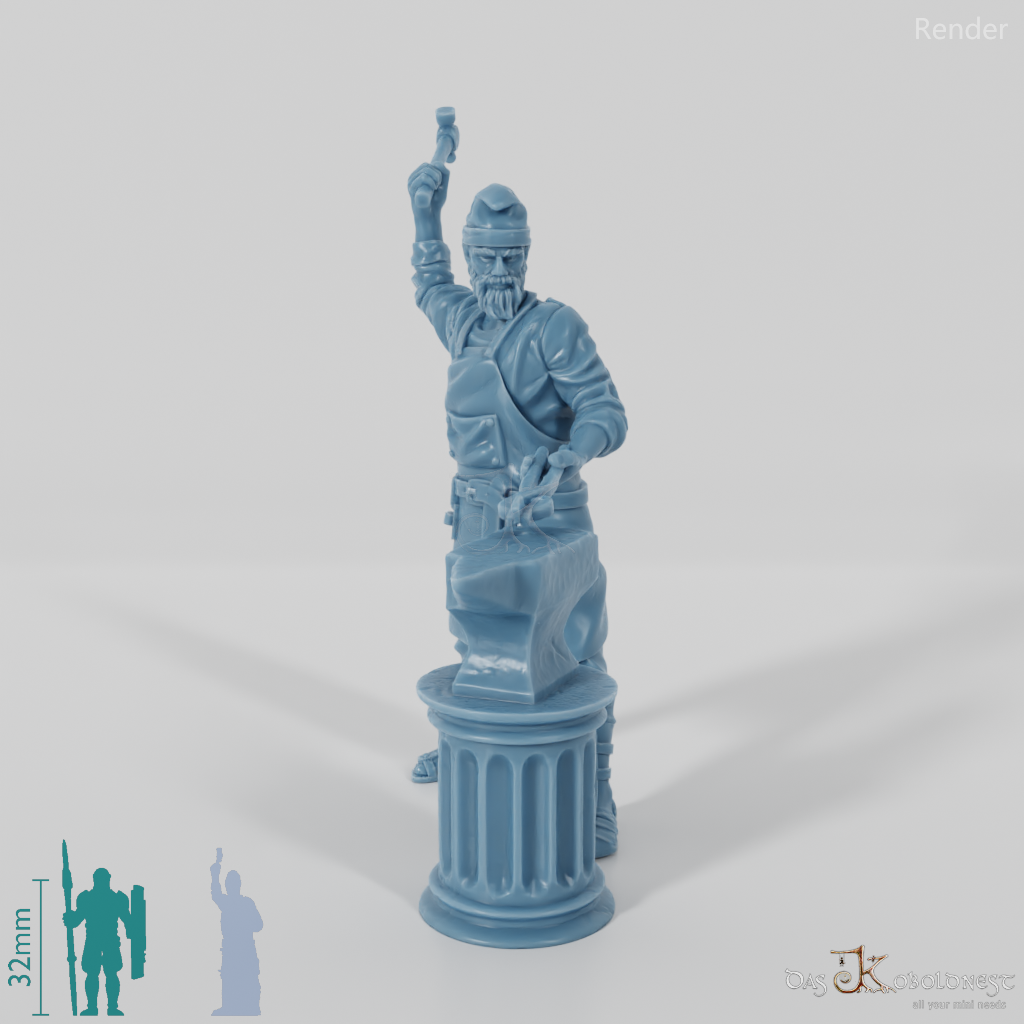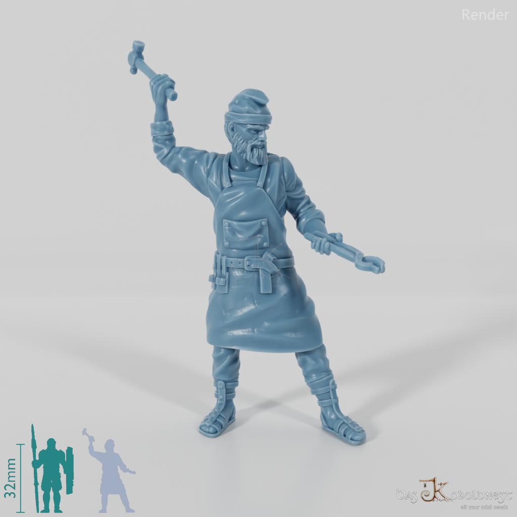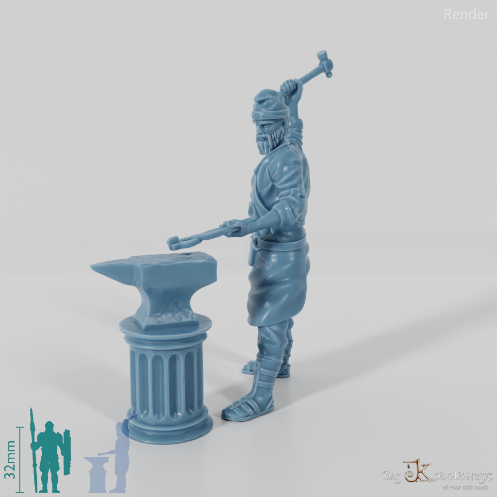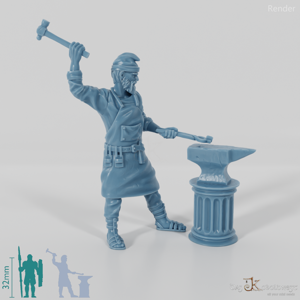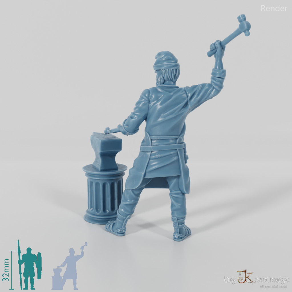 Schmied mit dicker Lederschürze, der mit Zange und Hammer an einem Amboss steht Modell wahlweise mit oder ohne Amboss verfügbar