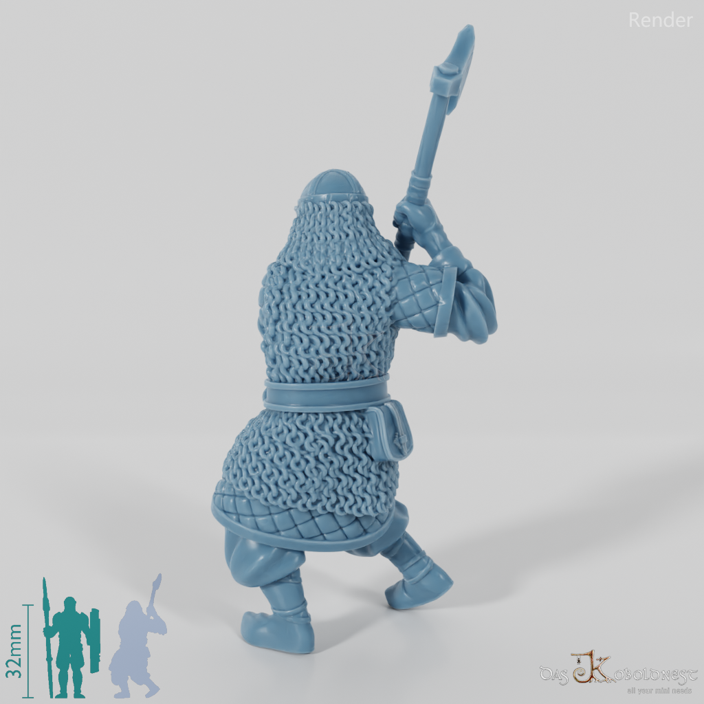 Mann in voller Kettenrüstung über dem Gambeson, der eine zweihändige Axt schwingt