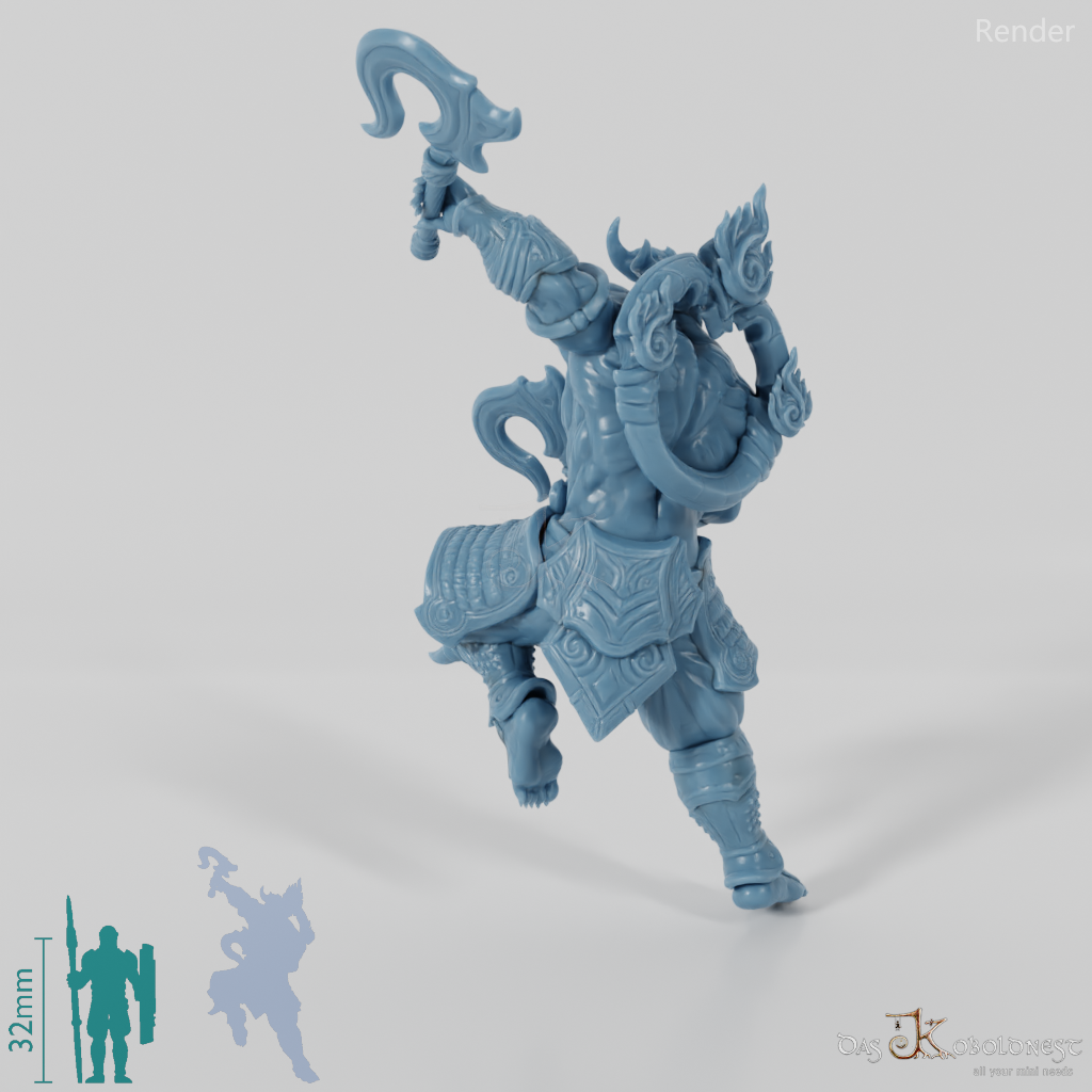 Dämonengesichtiger Kami des Feuers und einer der ältesten Shinto-Gottheiten, der mit zwei Äxten bewaffnet ist