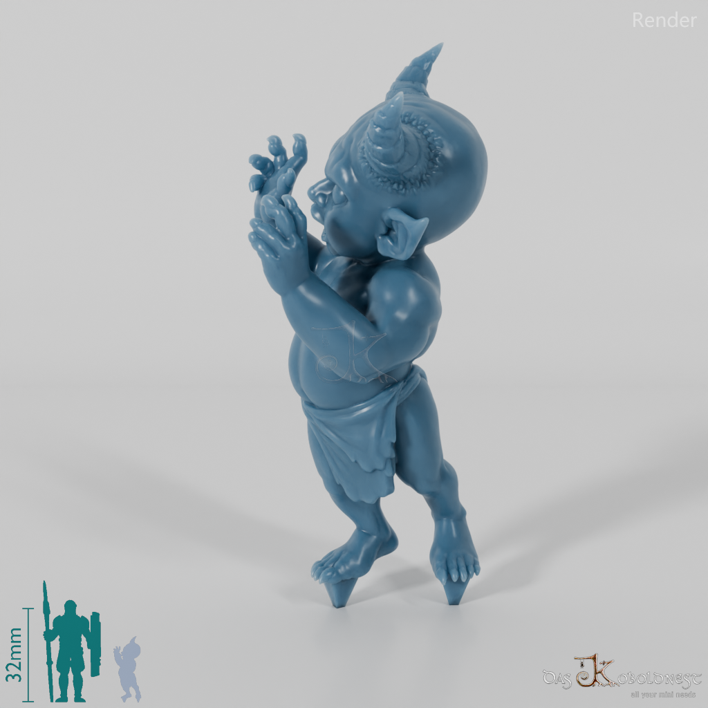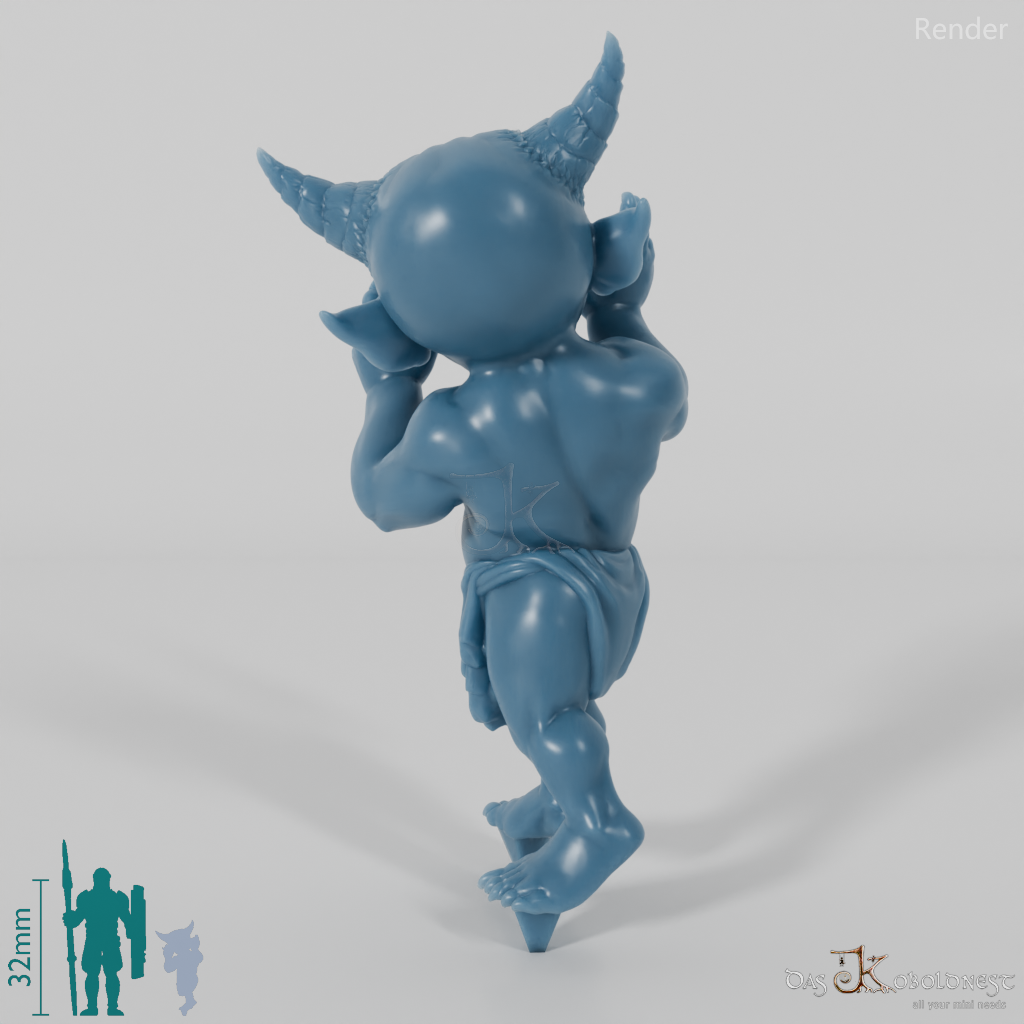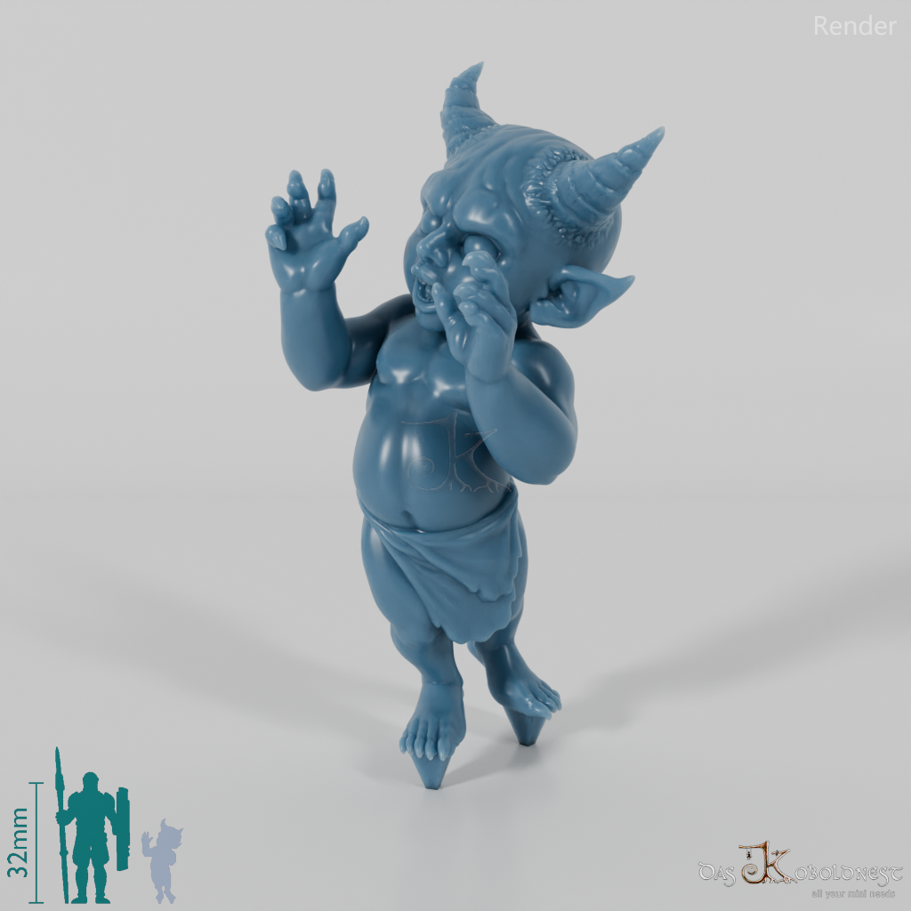 Teuflisches kleines Kind mit großen Augen, spitzen Ohren und gebogenen Hörnern.
