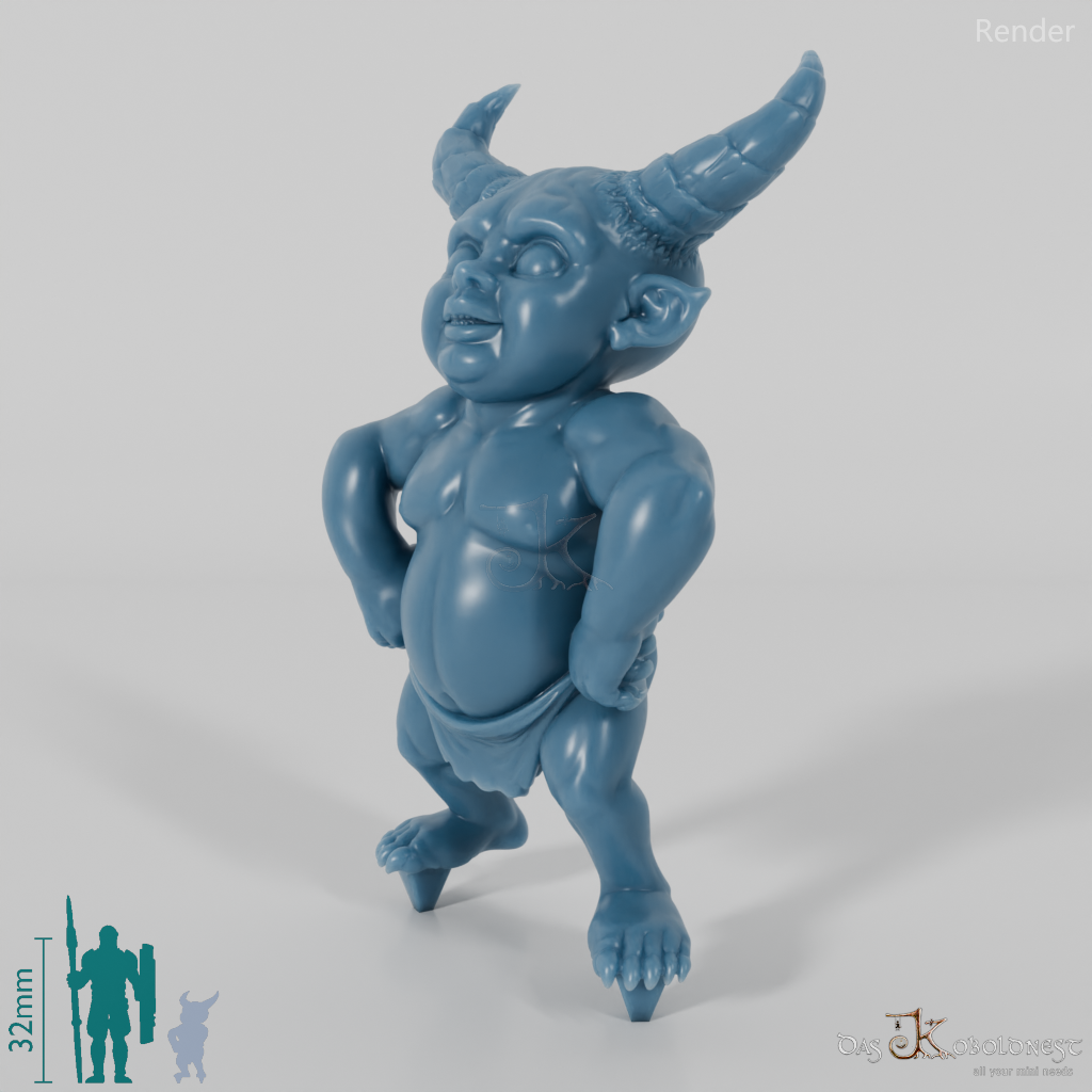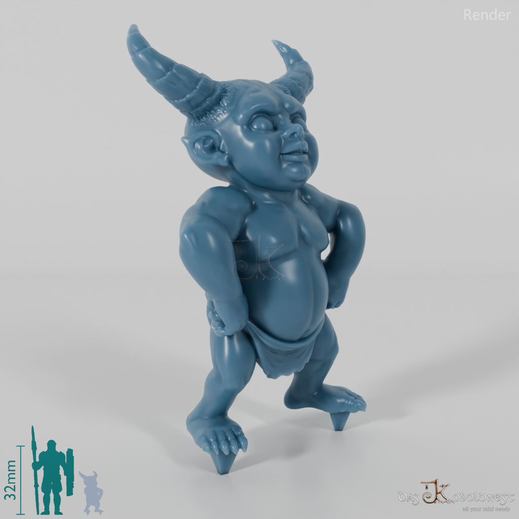 Teuflisches kleines Kind mit großen Augen, spitzen Ohren und gebogenen Hörnern.