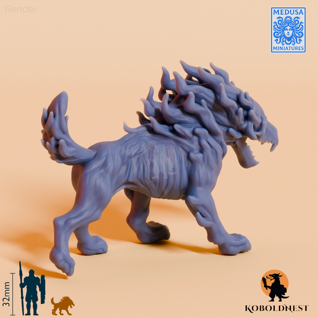 Flammender kleiner Höllenhund mit ausdruckslosem Blich im blanken Schädel