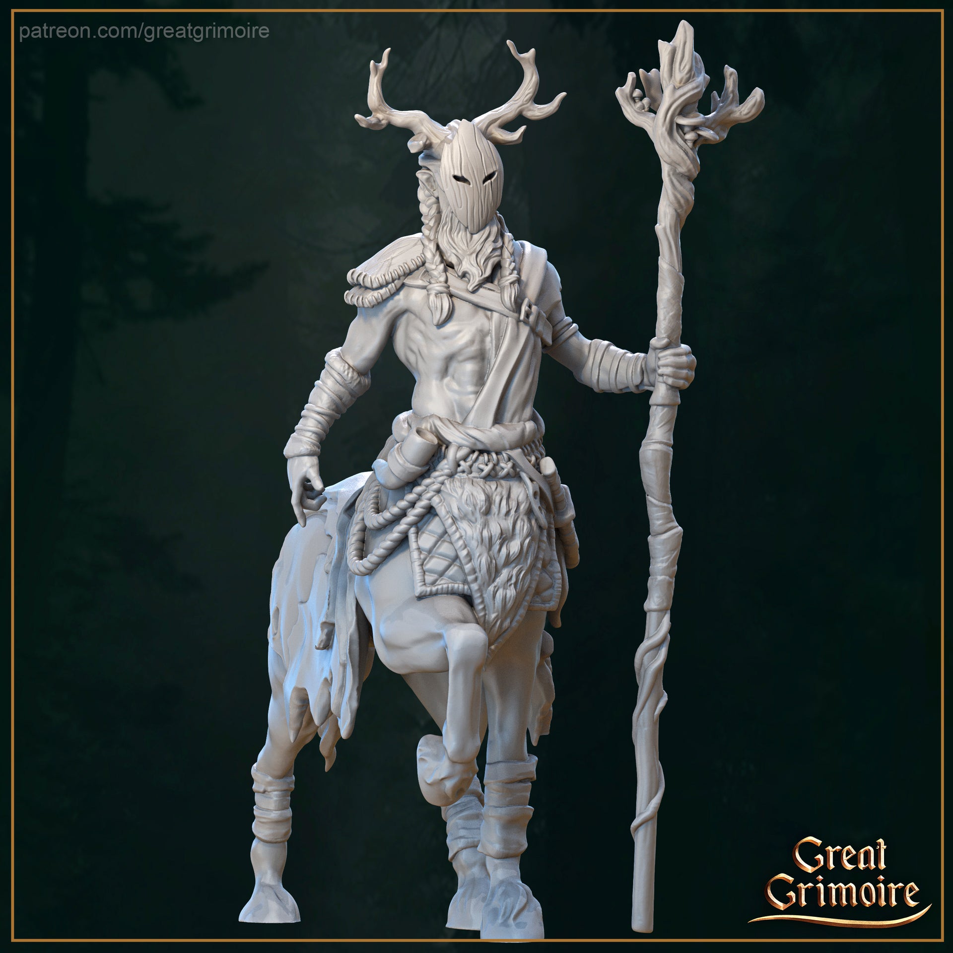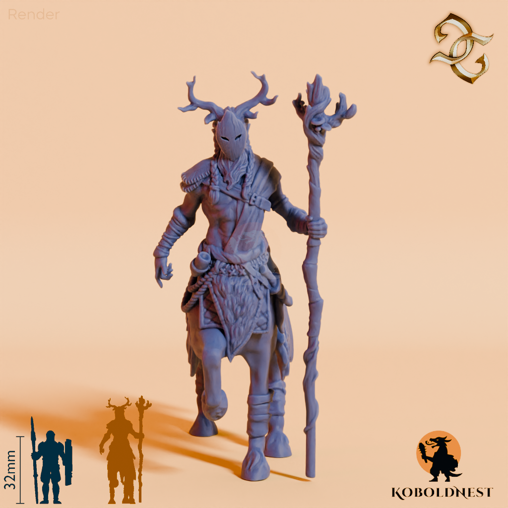 Maskierter Zentaure mit geflochtenen Haaren, der in Naturmatrialien gekleidet ist und einen knorrigen Stab trägt