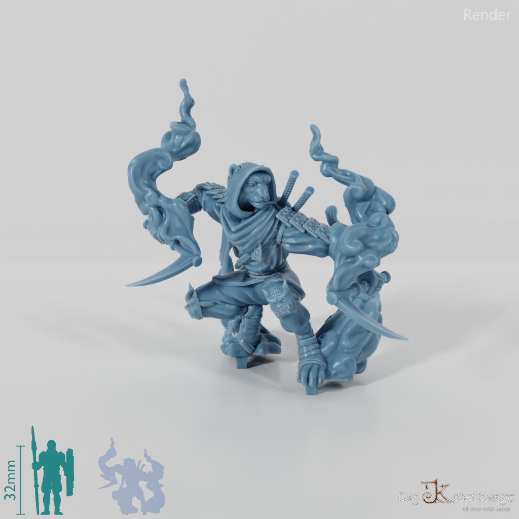 Von Nebel umhülltes Katzenvolk mit Rüstung und Kapuze, das mit zwei Kamas und zwei Schwertern auf dem Rücken bewaffnet ist