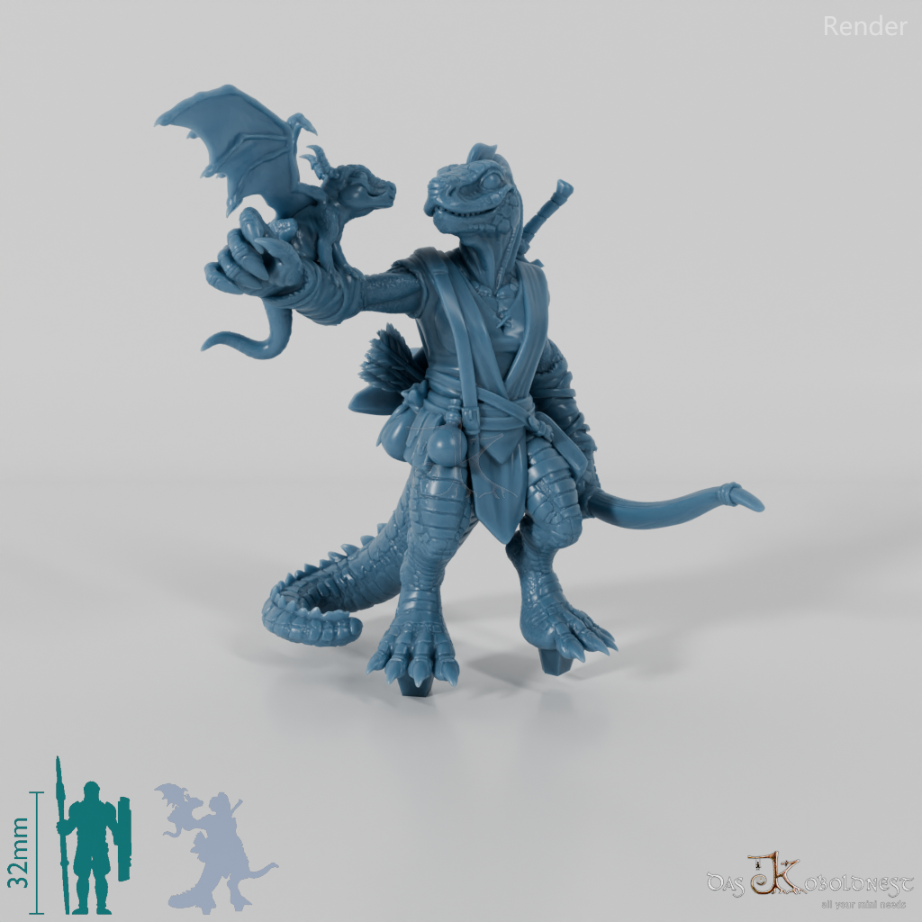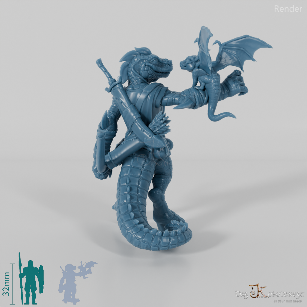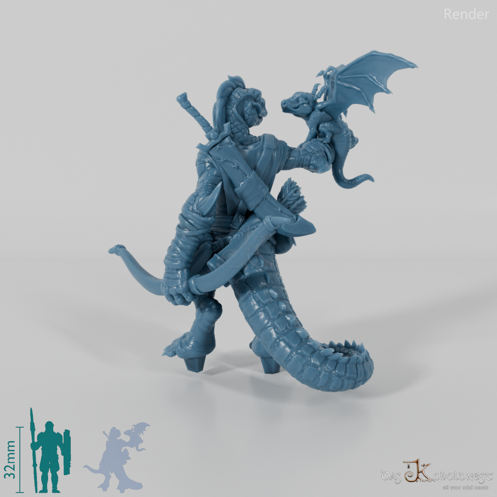Humanoide Echse in lockerer Kleidung, die einen Bogen in der Hand und einen winzigen Drachen auf dem Arm trägt.