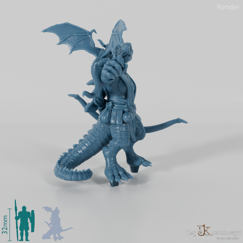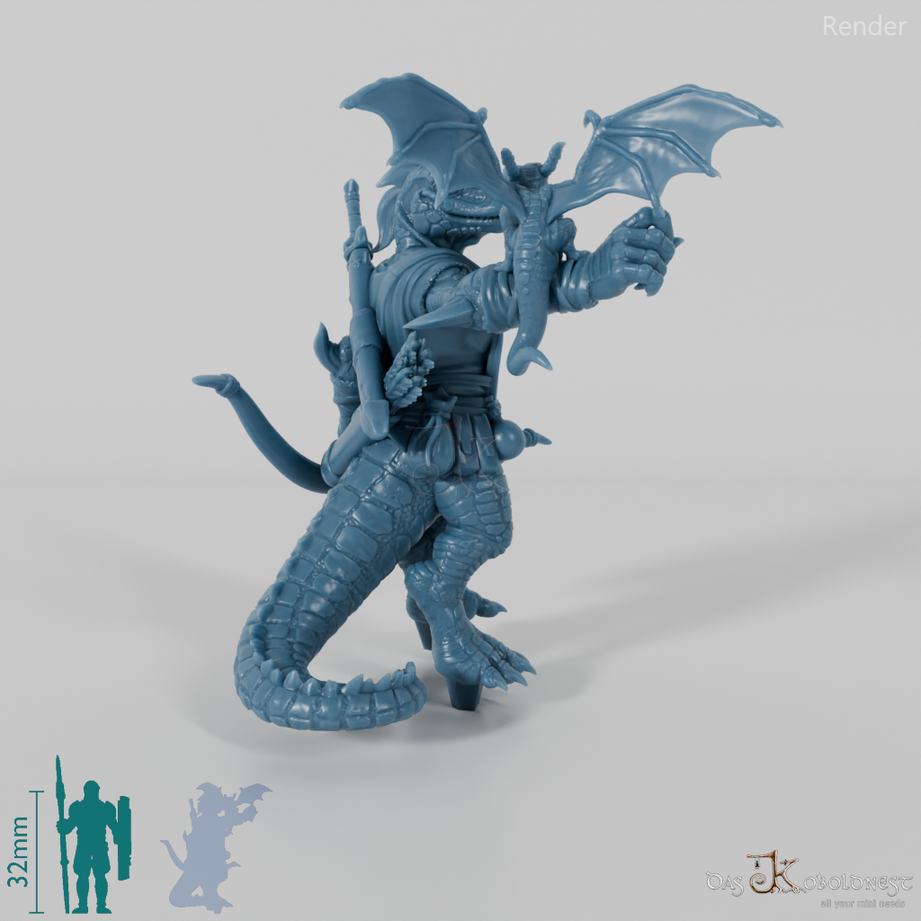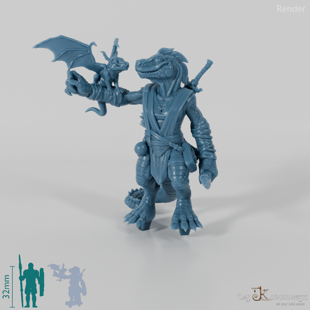 Humanoide Echse in lockerer Kleidung, die einen Bogen in der Hand und einen winzigen Drachen auf dem Arm trägt.
