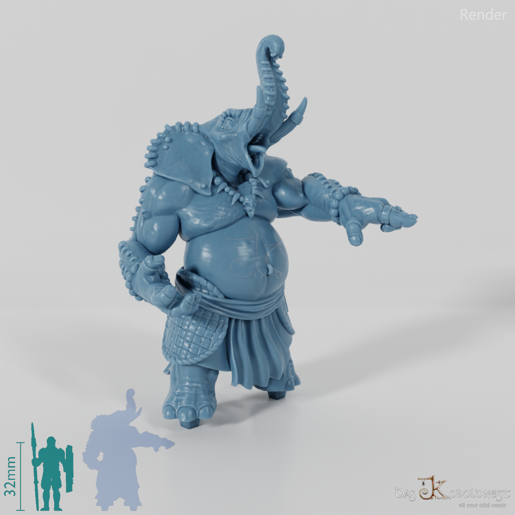 Humanoider Elefant mit Piercings und Schmucknarben, der eine Hand ausgestreckt hält