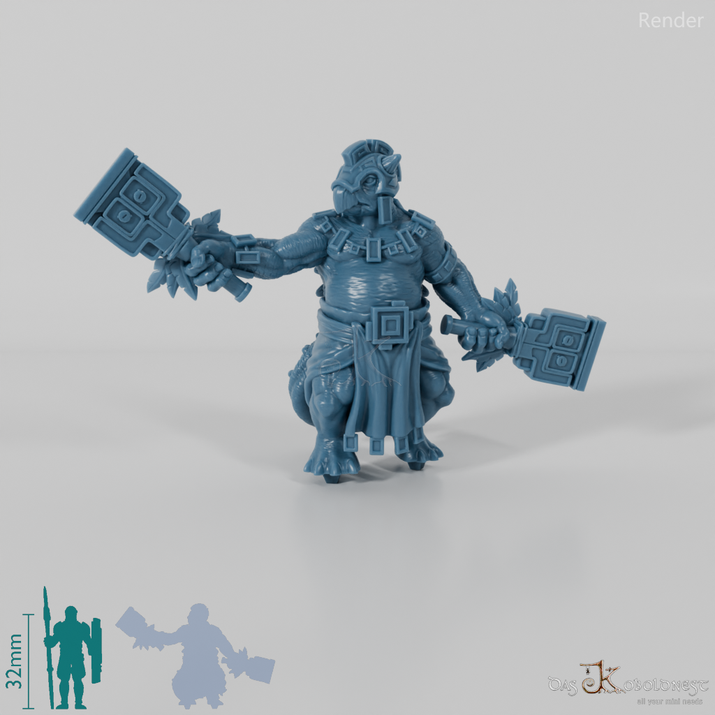 Humanoider Dinosaurier mit dorniger Schwanzkeule, Rüstung und zwei Hämmern in in mittelamerikanischem Stil