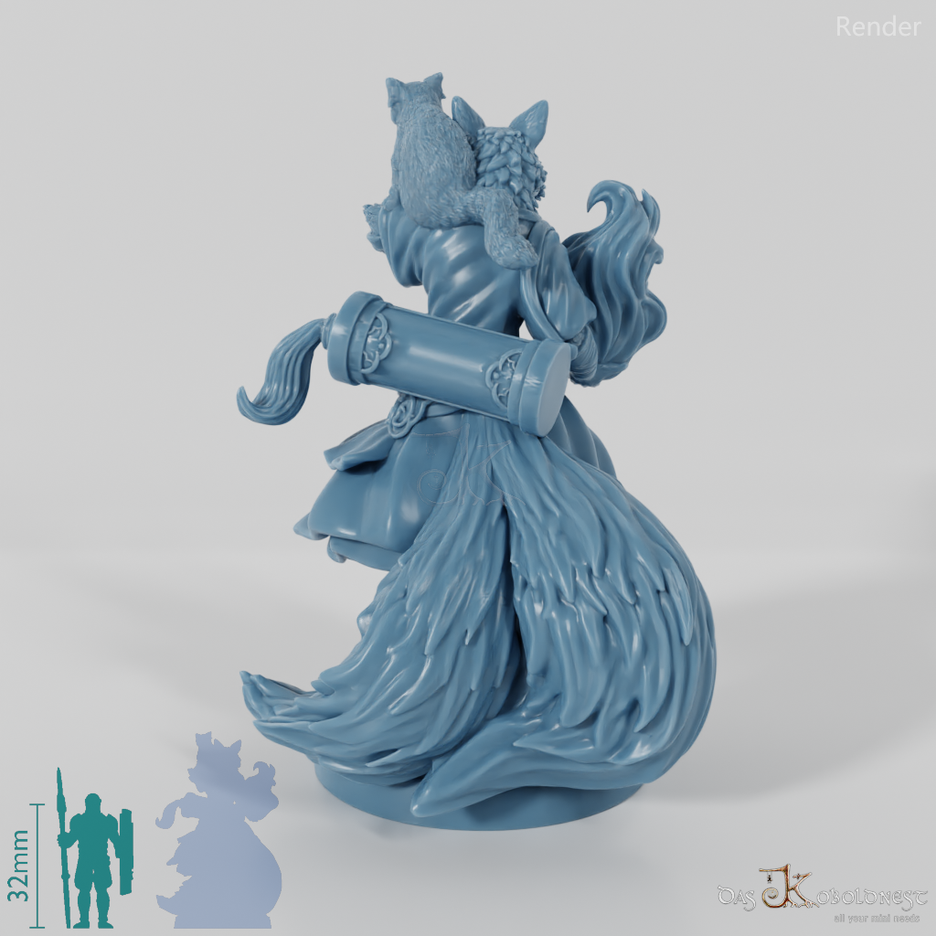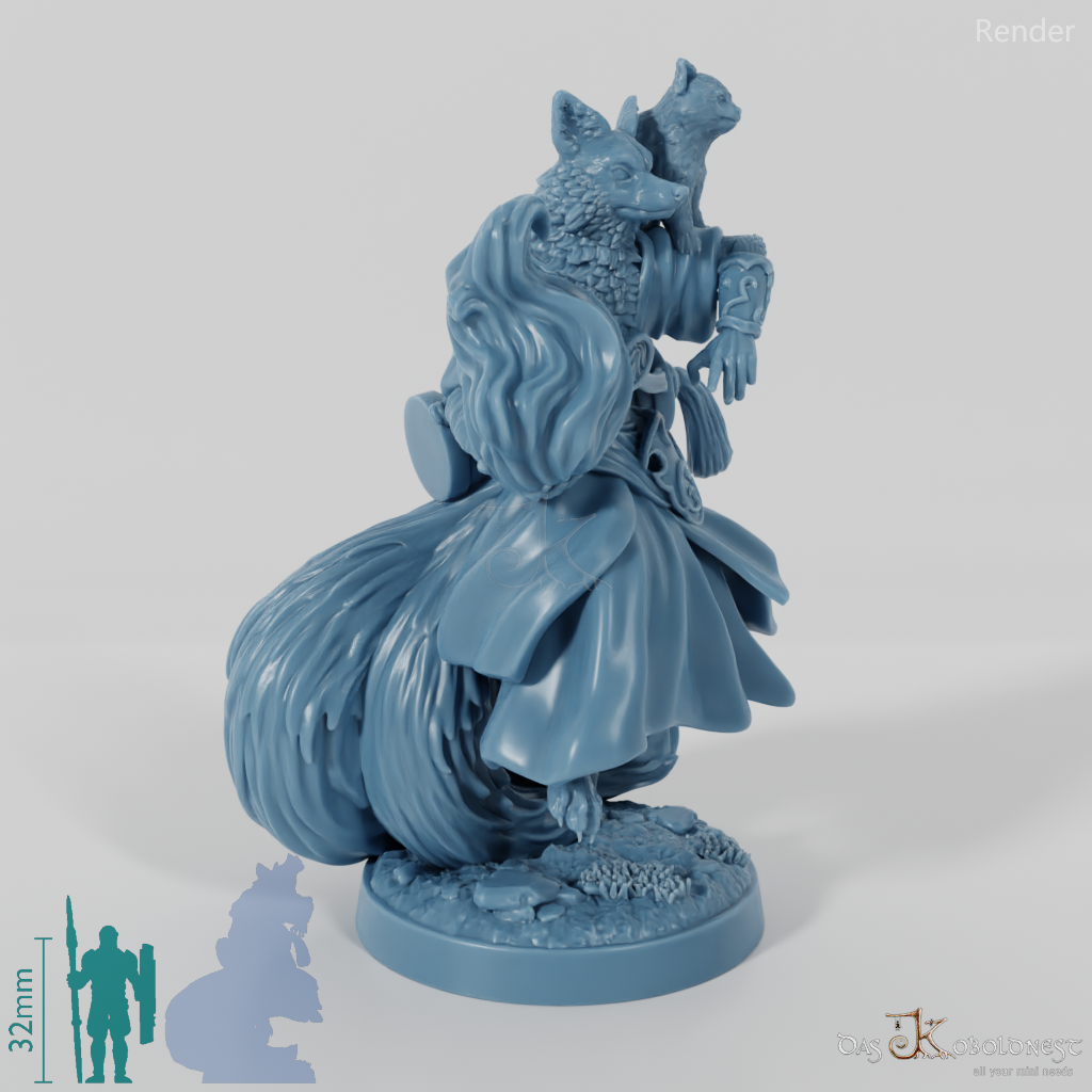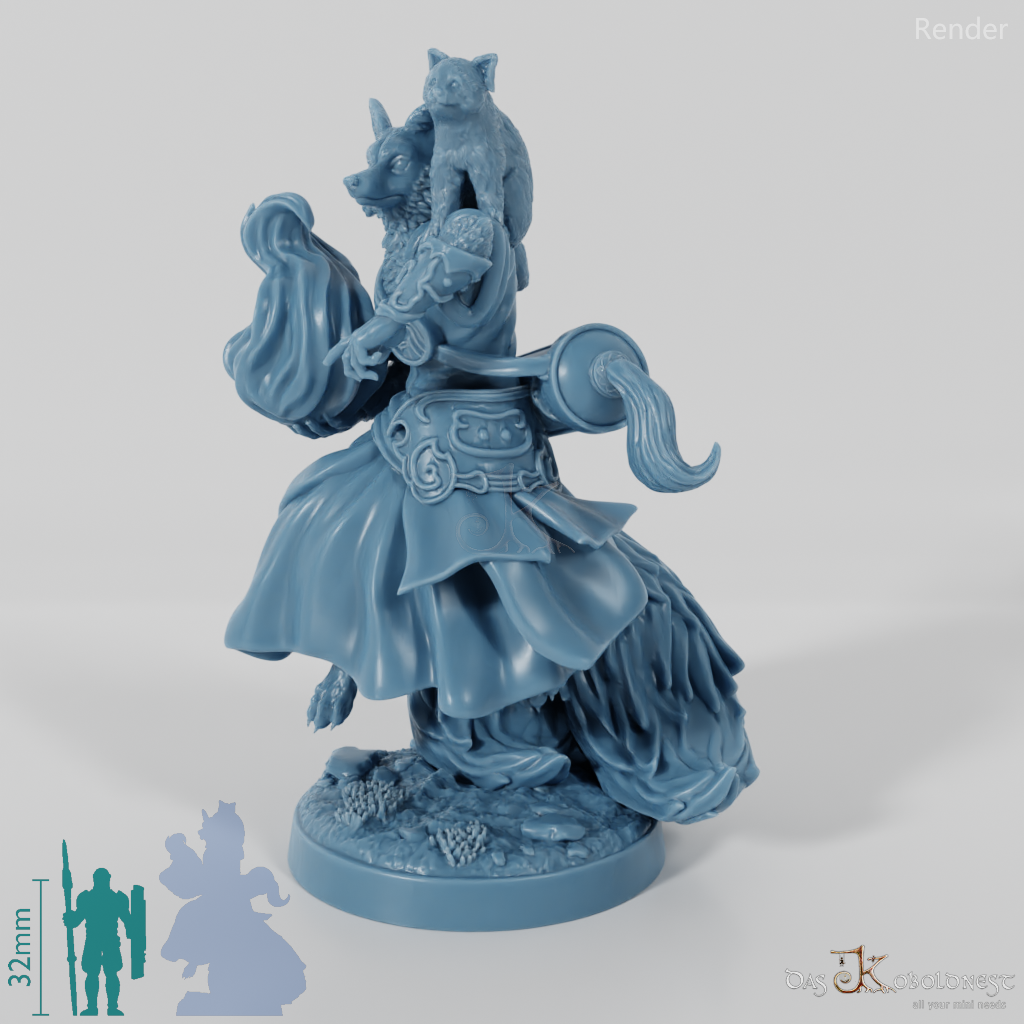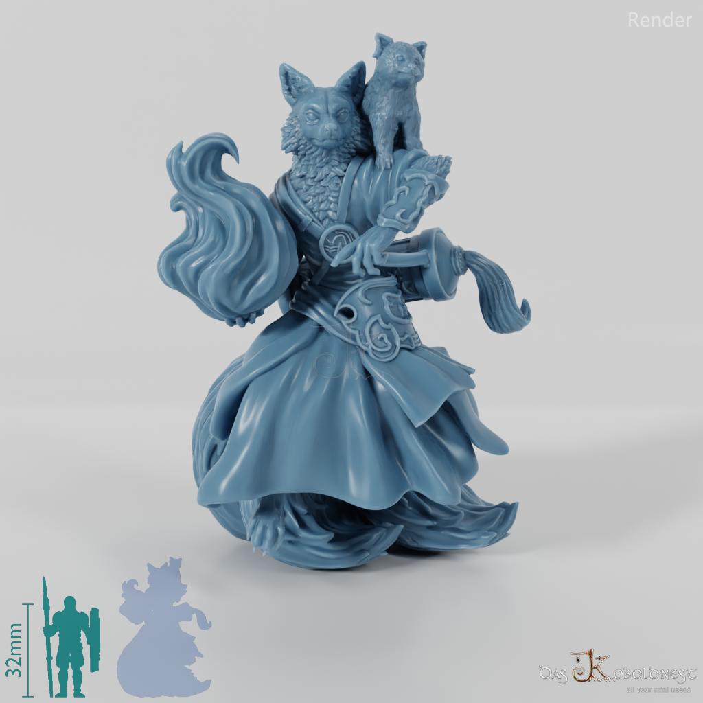 Vielschwänziger Fuchsvolk der eine Kette aus großen Kugeln um die Schultern trägt und eine Faust geballt hat Modell wahlweise mit oder ohne gestaltete 25mm-Rundbase verfügbar.