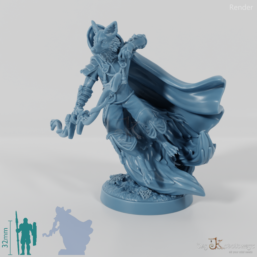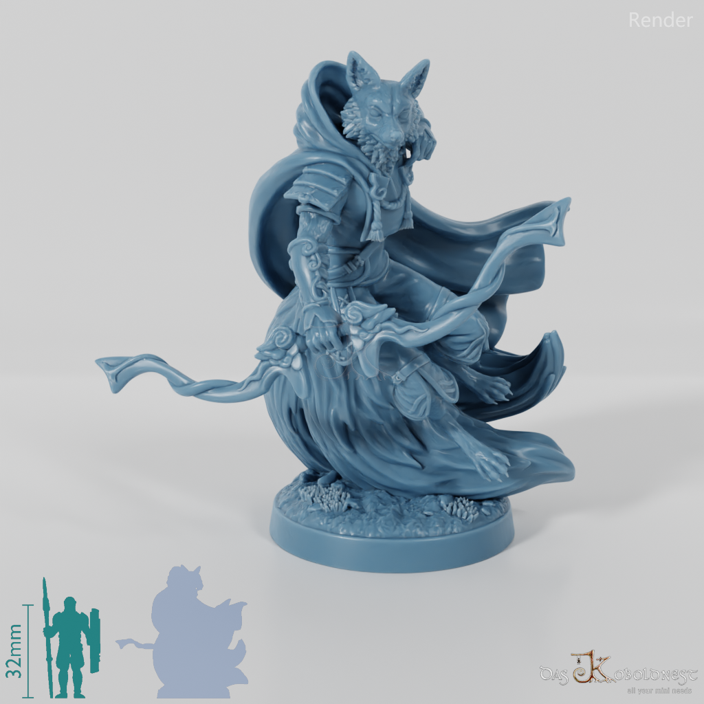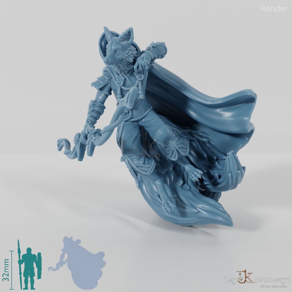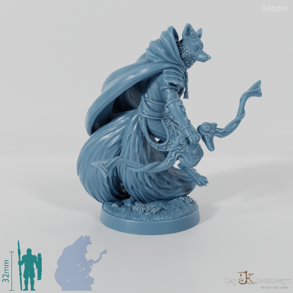 Vielschwänziger Fuchsvolk mit wehendem Mantel, der einen geschwungenen Bogen gezückt hat Modell wahlweise mit oder ohne gestaltete 25mm-Rundbase verfügbar.