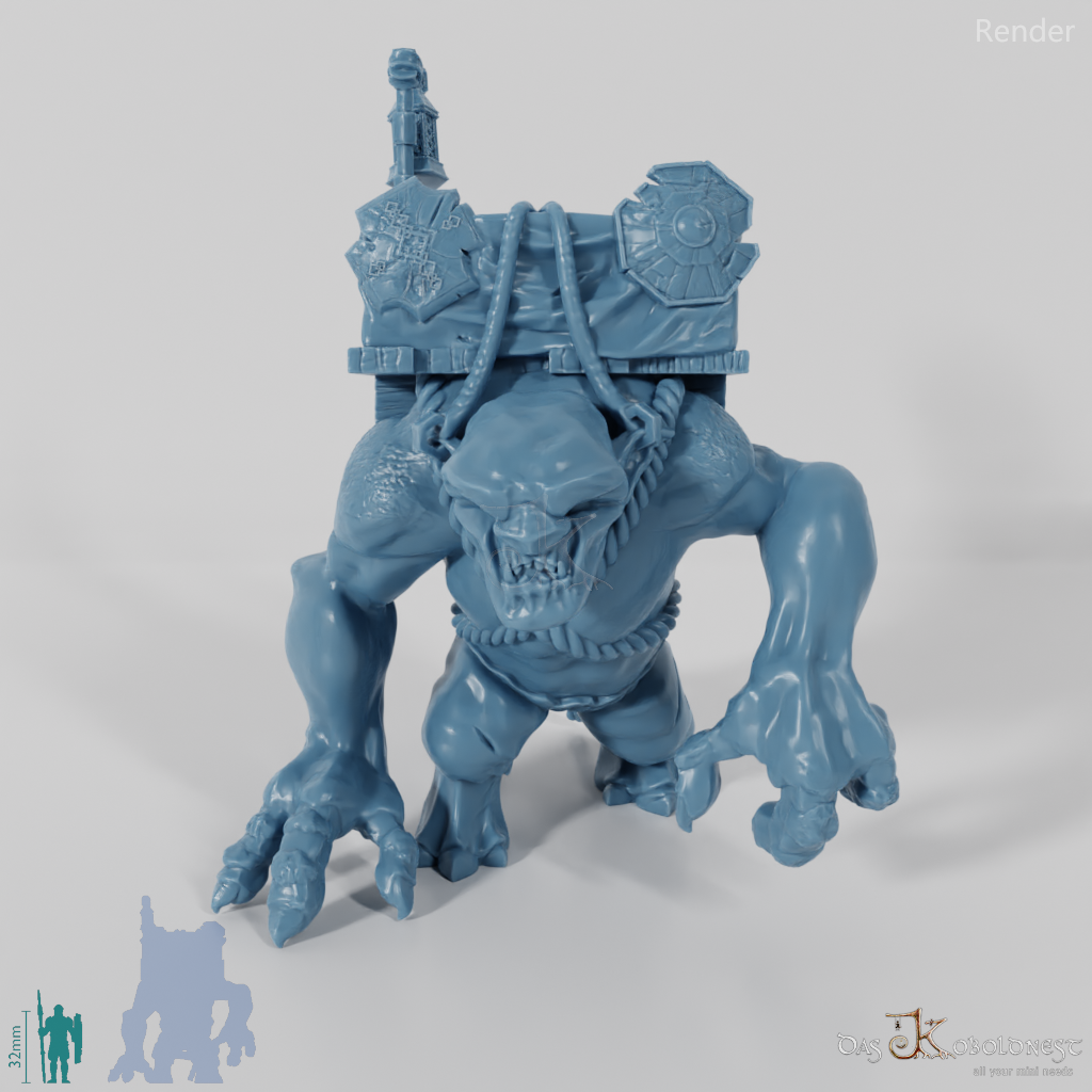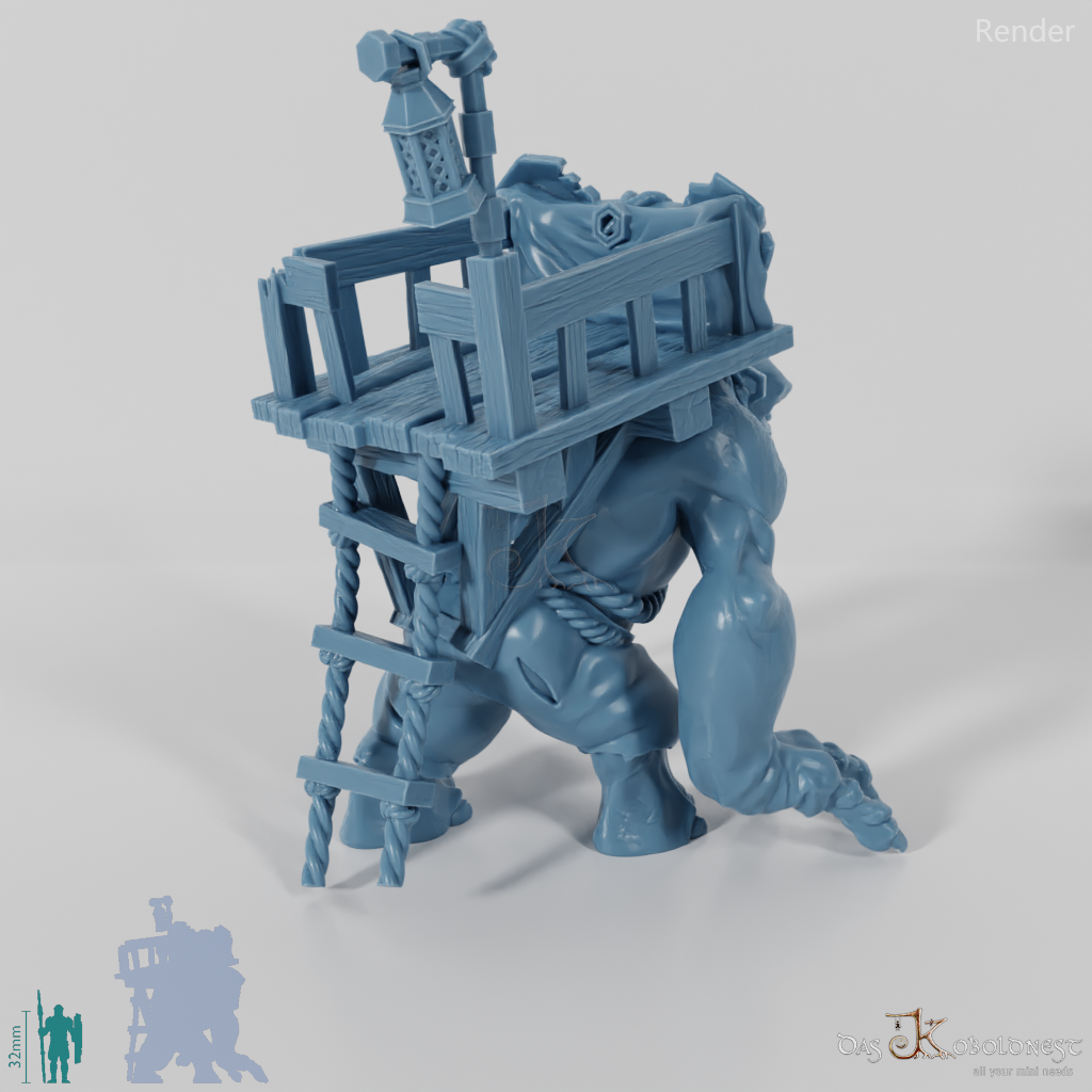 Massiger Troll, der eine mit Seilen verzurrte Aussichtsplattform auf dem Rücken trägt, von der eine Strickleiter herunterhängt. Die Plattform bietet Platz für 2-3 Goblins ohne Base.