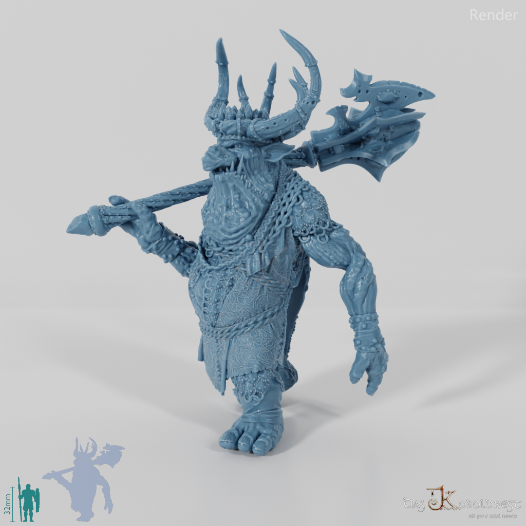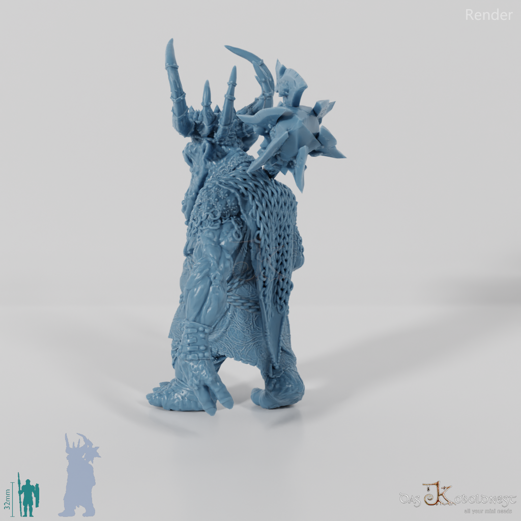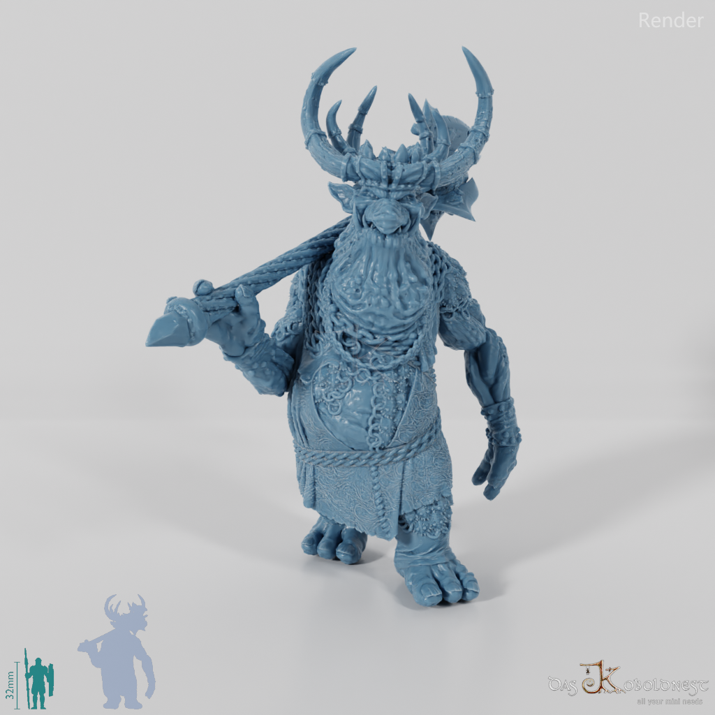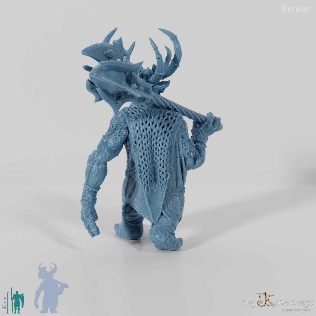 Troll mit gebogener Geweihkrone auf dem massigen Kopf, der eine gezackte Kriegskeule auf der Schulter trägt und mit einem Kettenhemd gerüstet ist