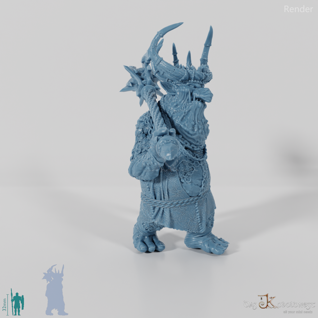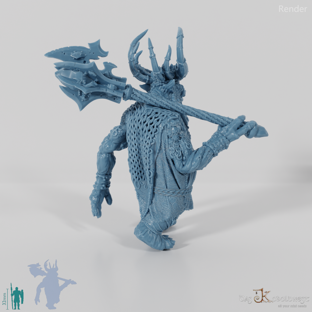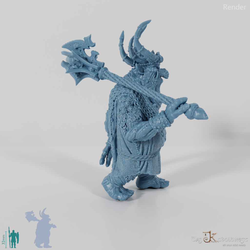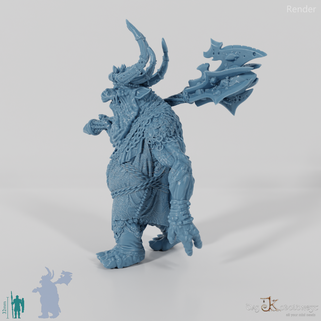 Troll mit gebogener Geweihkrone auf dem massigen Kopf, der eine gezackte Kriegskeule auf der Schulter trägt und mit einem Kettenhemd gerüstet ist
