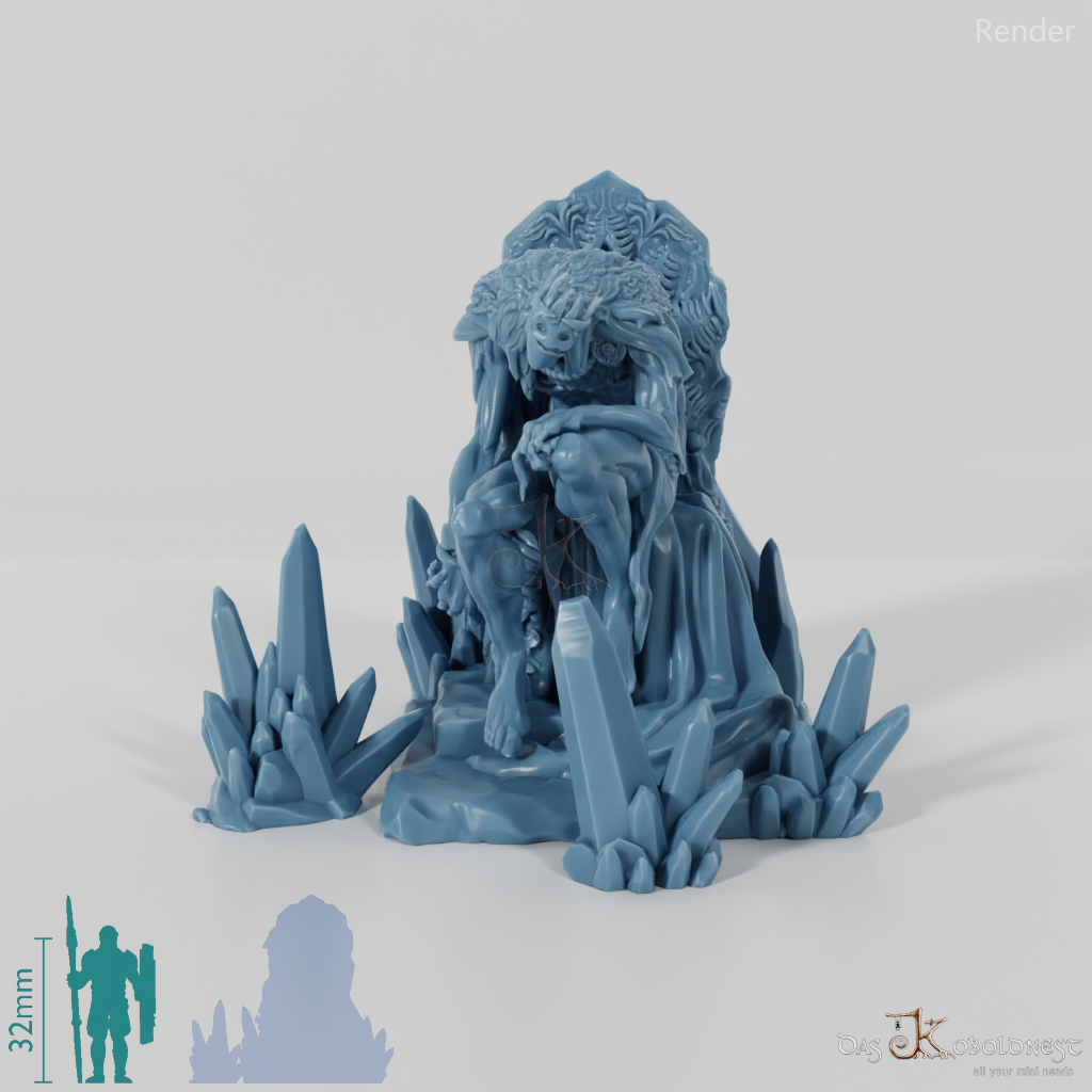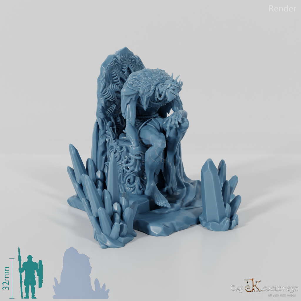 Humanoide Gestalt mit langen Gliedmaßen, die eine Krone und eine Maske trägt und auf einem von Kristallen umgebenen Thron sitzt