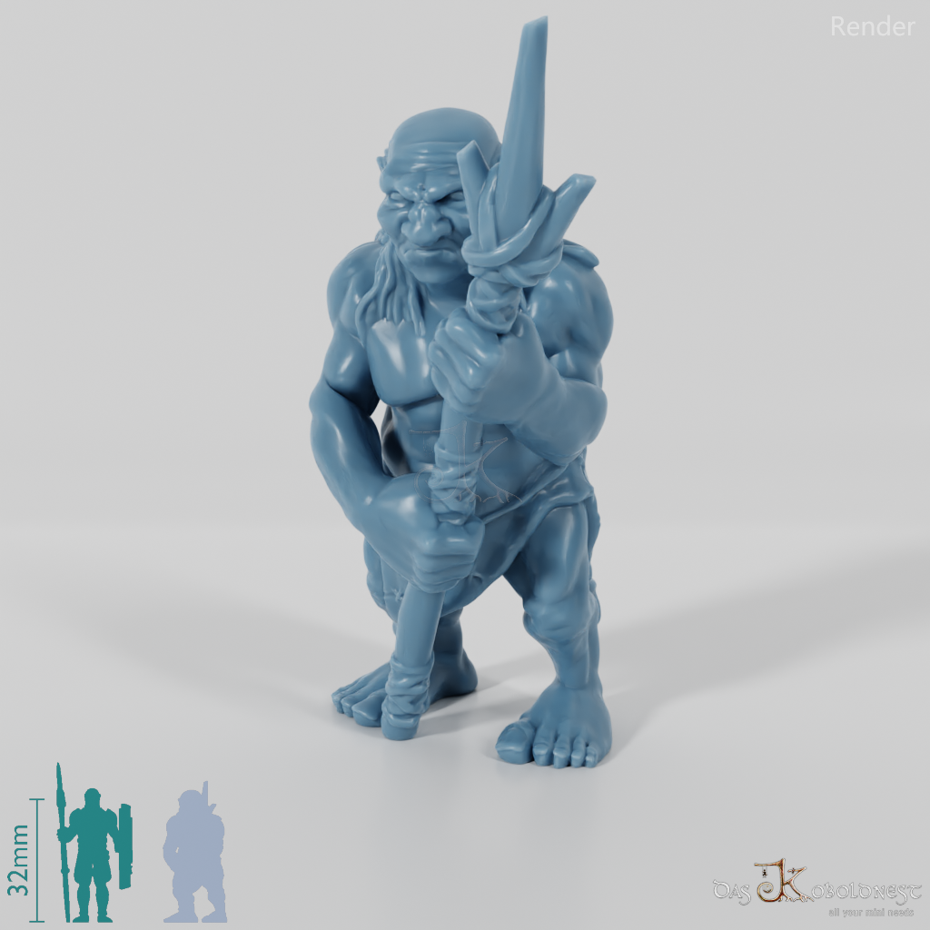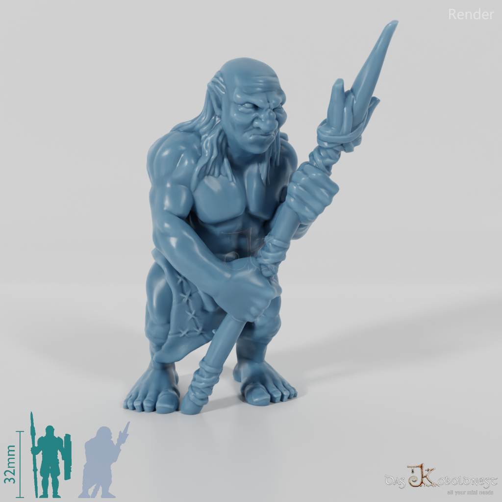 Höhlenbewohnender Humanoid, der mit ledernem Lendenschurz bekleidet ist und eine grobe Waffe trägt