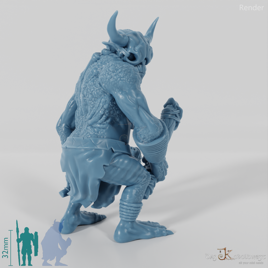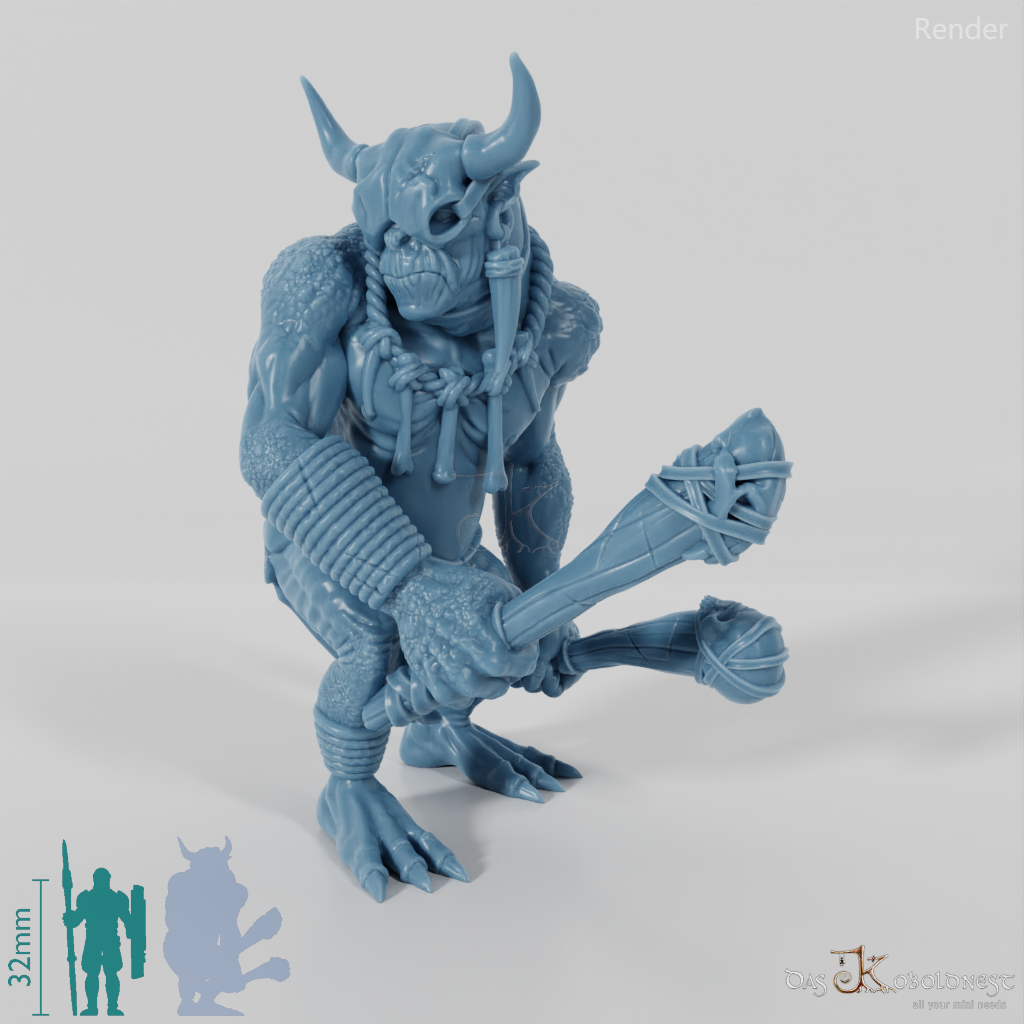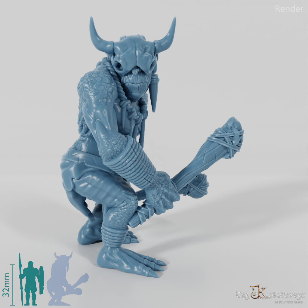 Erlebe die beeindruckende Präsenz des Halbtrolls der Südlande. Diese Kreatur, gezeichnet von großer Statur, mächtigen Pranken und grober, runzeliger Haut, strahlt rohe Kraft und Wildheit aus. In einer knochenverzierten Stammestracht, die seine Verbindung zu den Südlanden betont, steht er bereit und wachsam in Angriffshaltung mit seiner beeindruckenden Waffe.
