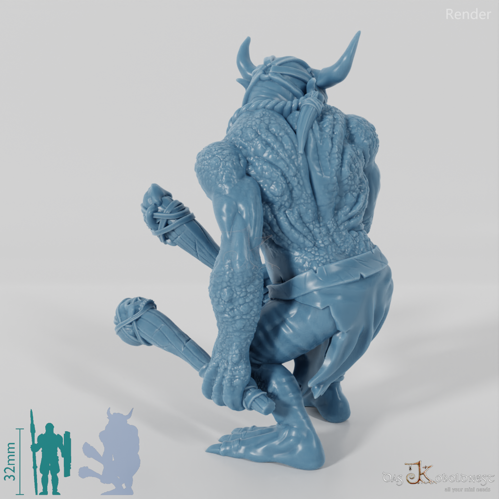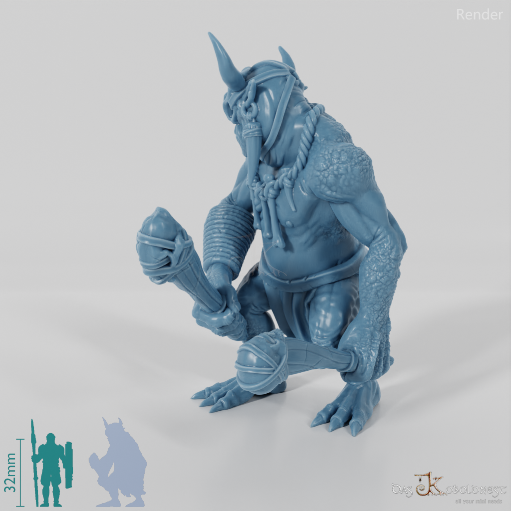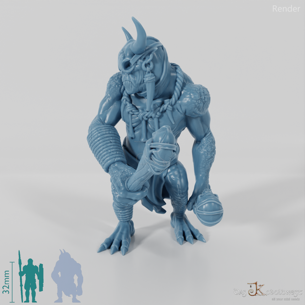 Erlebe die beeindruckende Präsenz des Halbtrolls der Südlande. Diese Kreatur, gezeichnet von großer Statur, mächtigen Pranken und grober, runzeliger Haut, strahlt rohe Kraft und Wildheit aus. In einer knochenverzierten Stammestracht, die seine Verbindung zu den Südlanden betont, steht er bereit und wachsam in Angriffshaltung mit seiner beeindruckenden Waffe.
