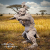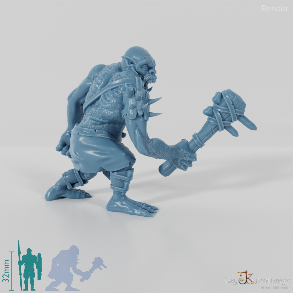 Erlebe die beeindruckende Präsenz des Halbtrolls der Südlande. Diese Kreatur, gezeichnet von großer Statur, mächtigen Pranken und grober, runzeliger Haut, strahlt rohe Kraft und Wildheit aus. In einer knochenverzierten Stammestracht, die seine Verbindung zu den Südlanden betont, steht er bereit und wachsam in Angriffshaltung mit seiner beeindruckenden Waffe.