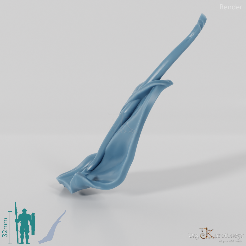 Zur rechten Seite geblähter Umhang, auf dem ein Langbogen befestigt ist. Das Modell kann beliebig mit allen modularen Modellen der Reihe "Die Elfen versammeln sich" kombiniert werden. Modell in Originalpose, sowie gespiegelter Pose verfügbar.
