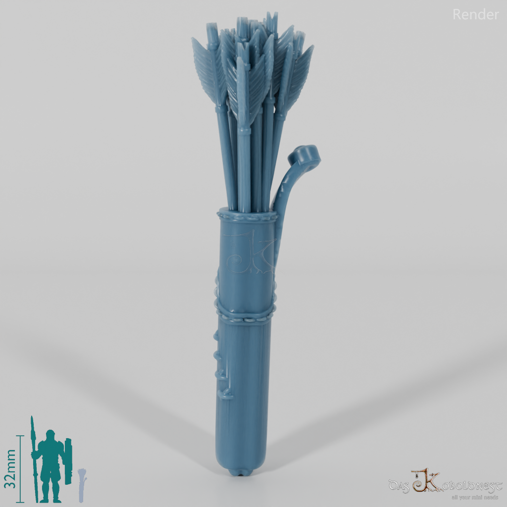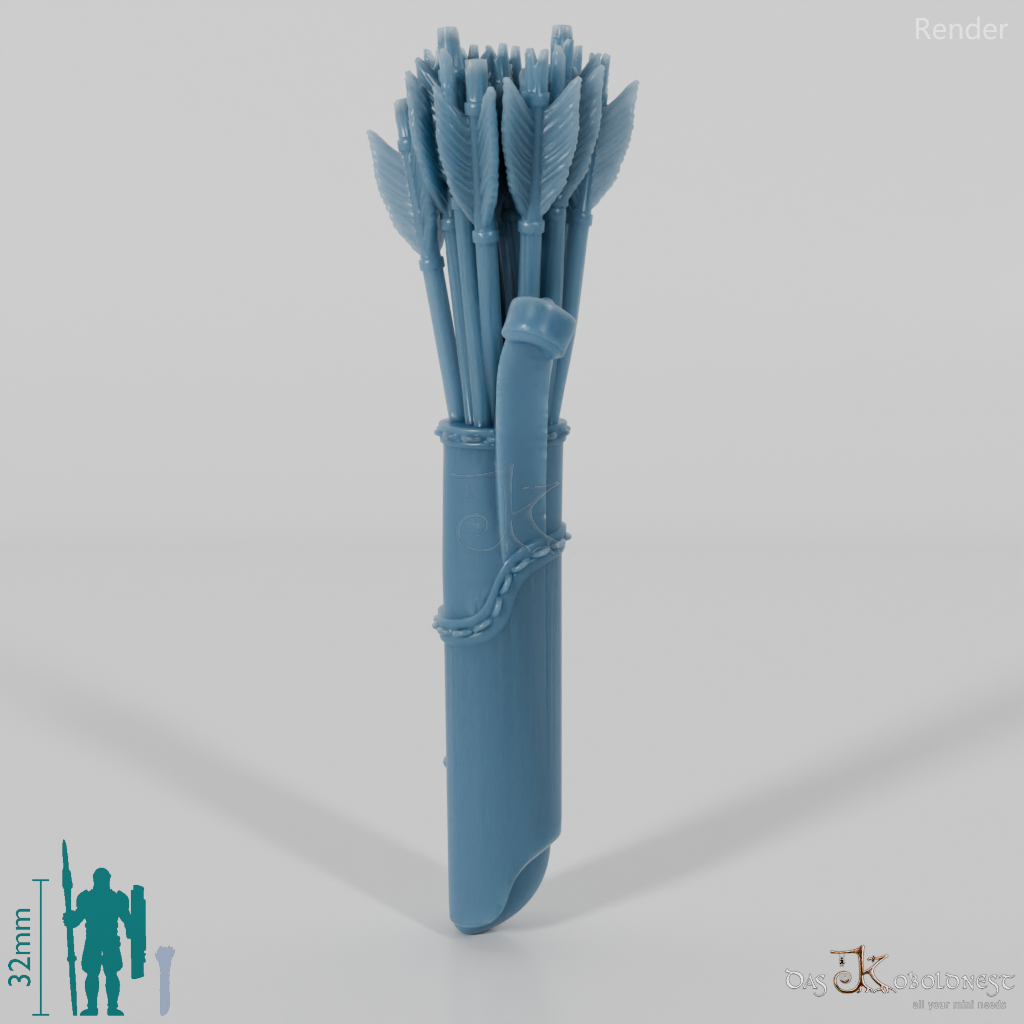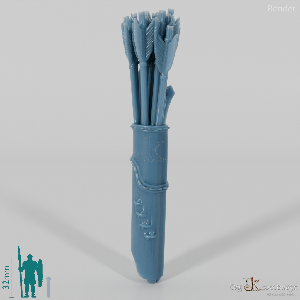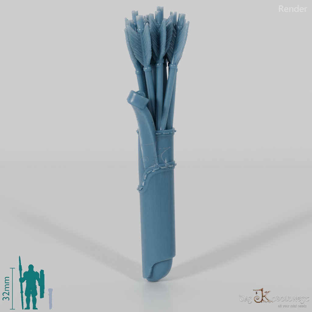 Köcher eines Halblings, der voller Pfeile ist und am Rücken befestigt werden kann. Das Modell kann beliebig mit allen modularen Körpern der Reihe "Greenshire Vigilantes" kombiniert werden. Im Customizer von The Printing Goes Ever On kannst du dir selbst eine Vorschau deiner modularen Halblingarmee erstellen und die perfekten Kombinationen für dich finden.