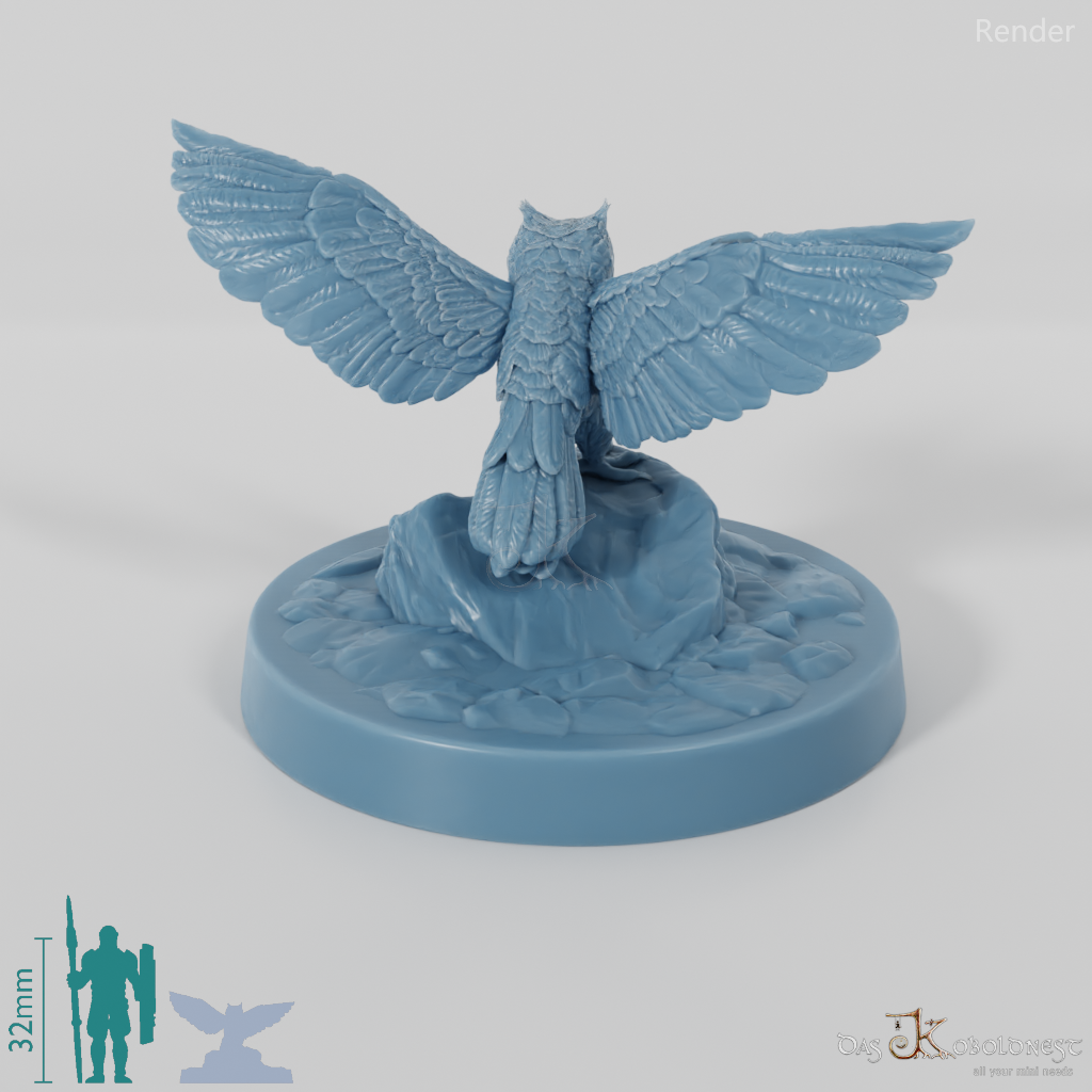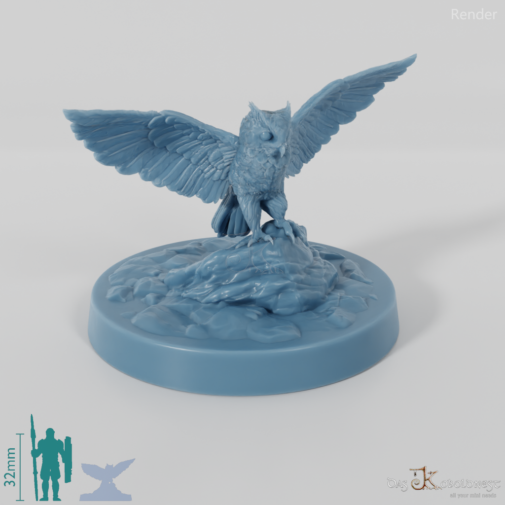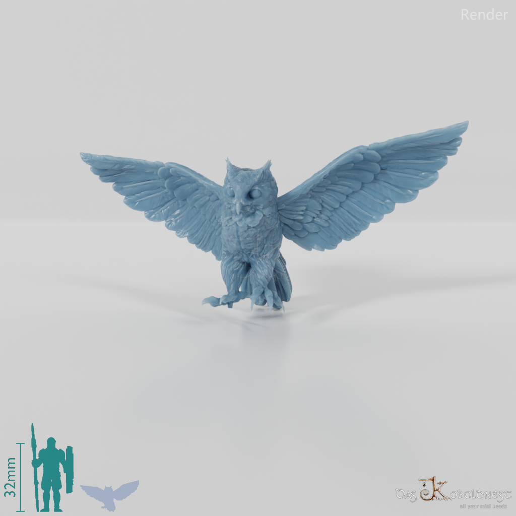 Kleine Eule mit Federpinseln auf dem Kopf, die mit ausgebreiteten Flügeln landet