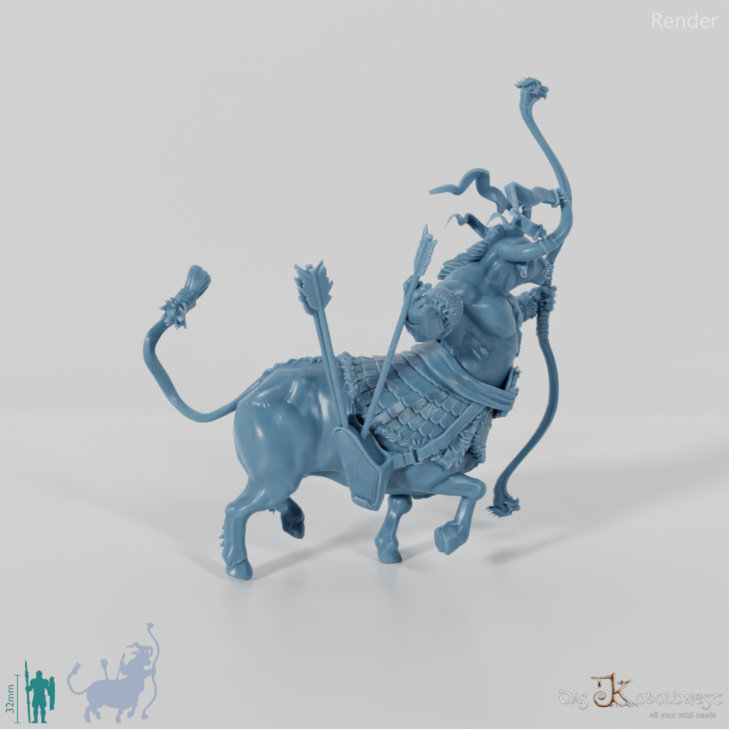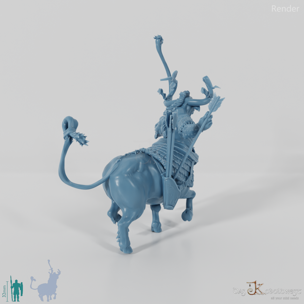 Gerüsteter Zentauren-Bogenschütze mit Stierkopf, der mit einem mit Drachenkopf verzierten Langbogen bewaffnet ist