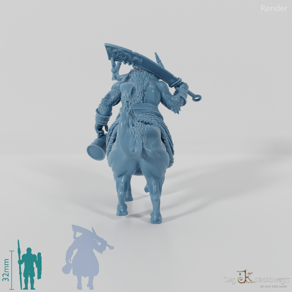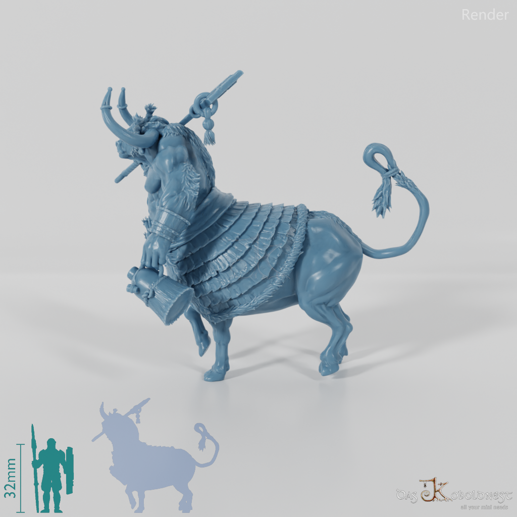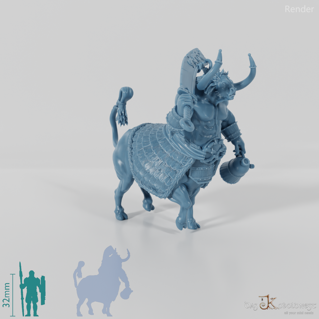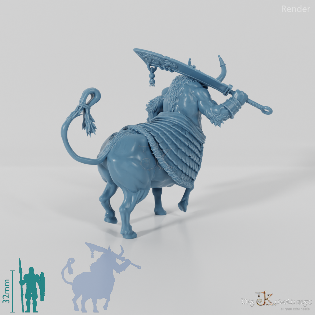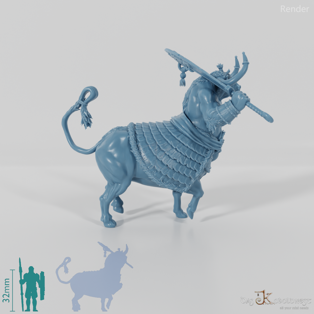 Schwer gerüsteter Zentauren-Krieger mit Stierkopf, der mit einem gebogenen Zweihandschwert bewaffnet ist