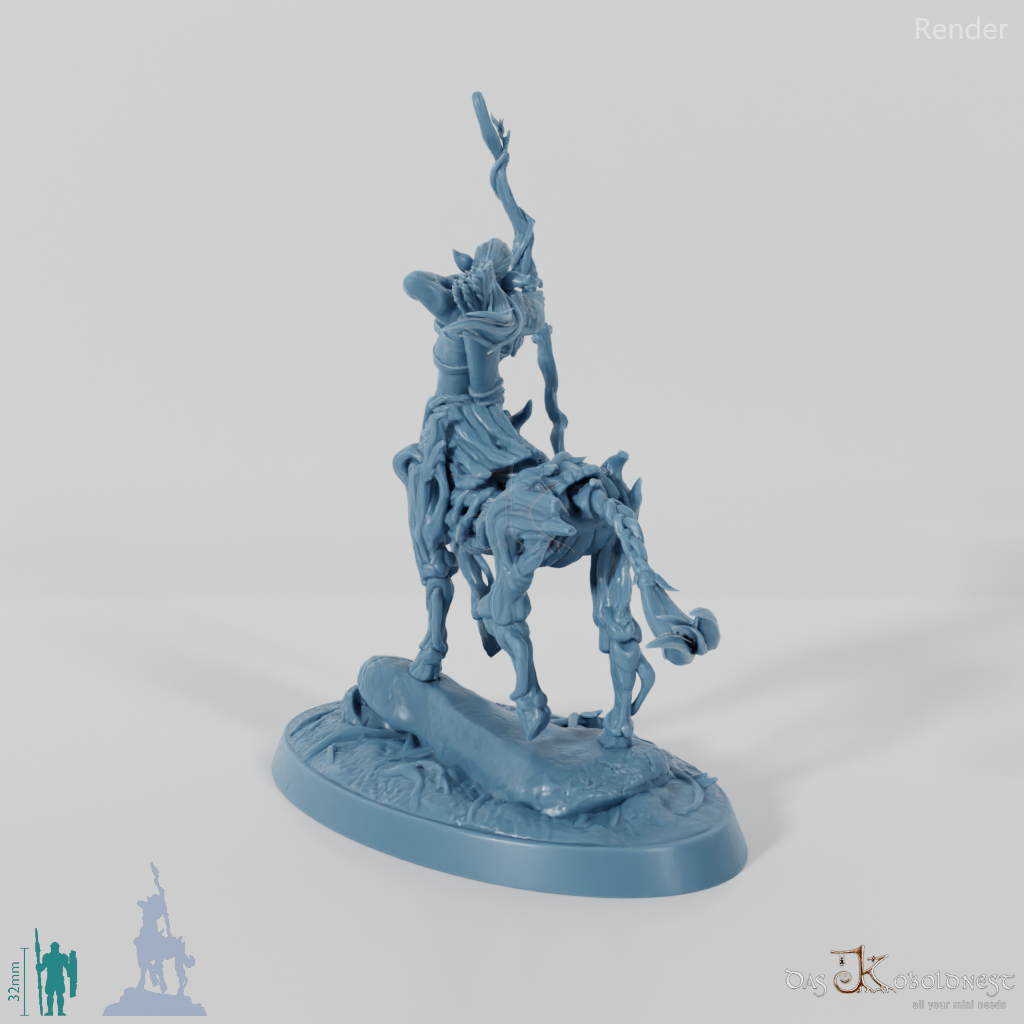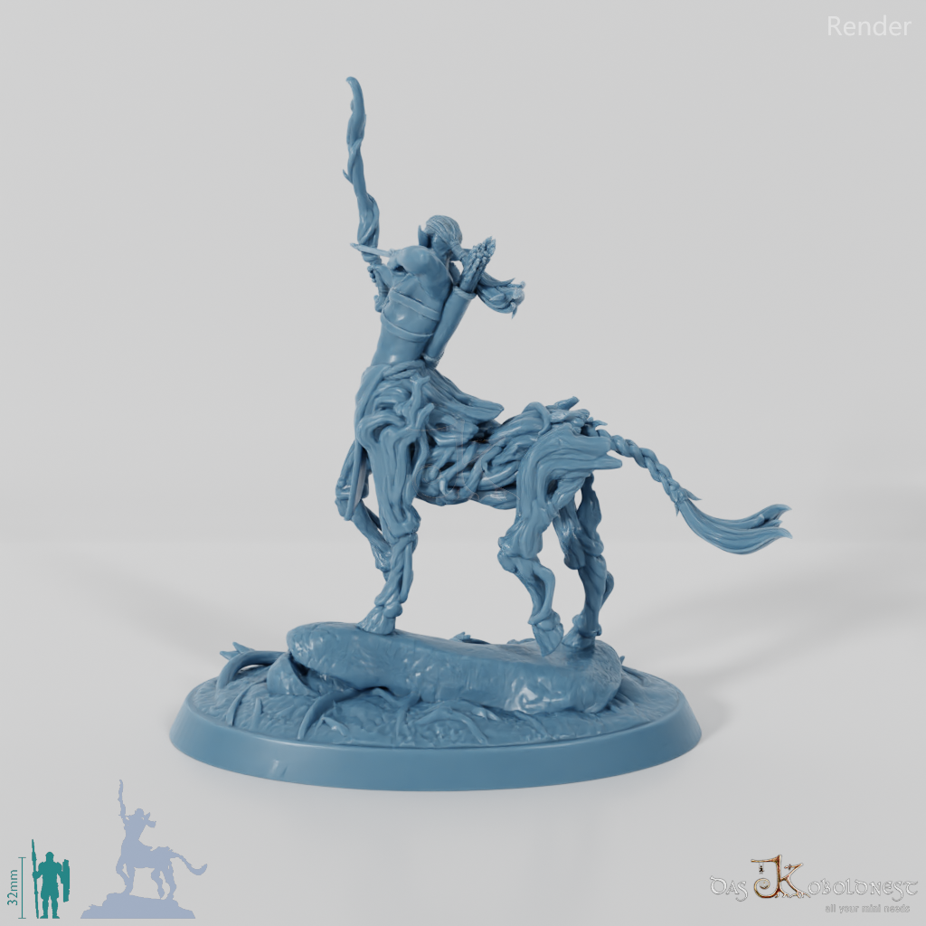 Zentaure mit dem Oberkörper eines athletischen Elfen und dem Unterkörper eines Pferdes aus Baumrinde, Ranken und Holz, der mit einem knorrigen Bogen bewaffnet ist.