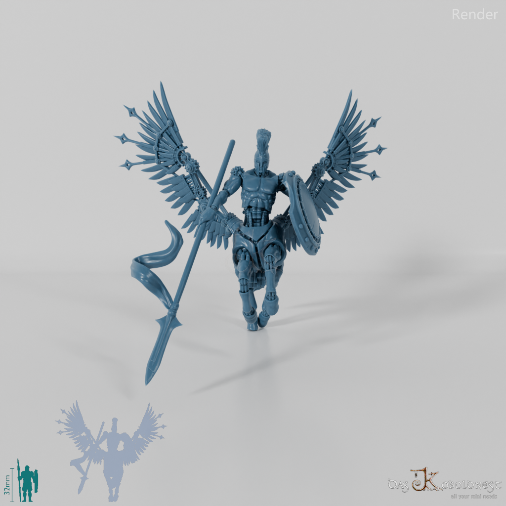 Eindrucksvoller mechanischer Zentaure mit Uhrwerkschwingen und zahnradgetriebenen Gelenken, der galoppierend einen Speer und einen großen Schild hält.