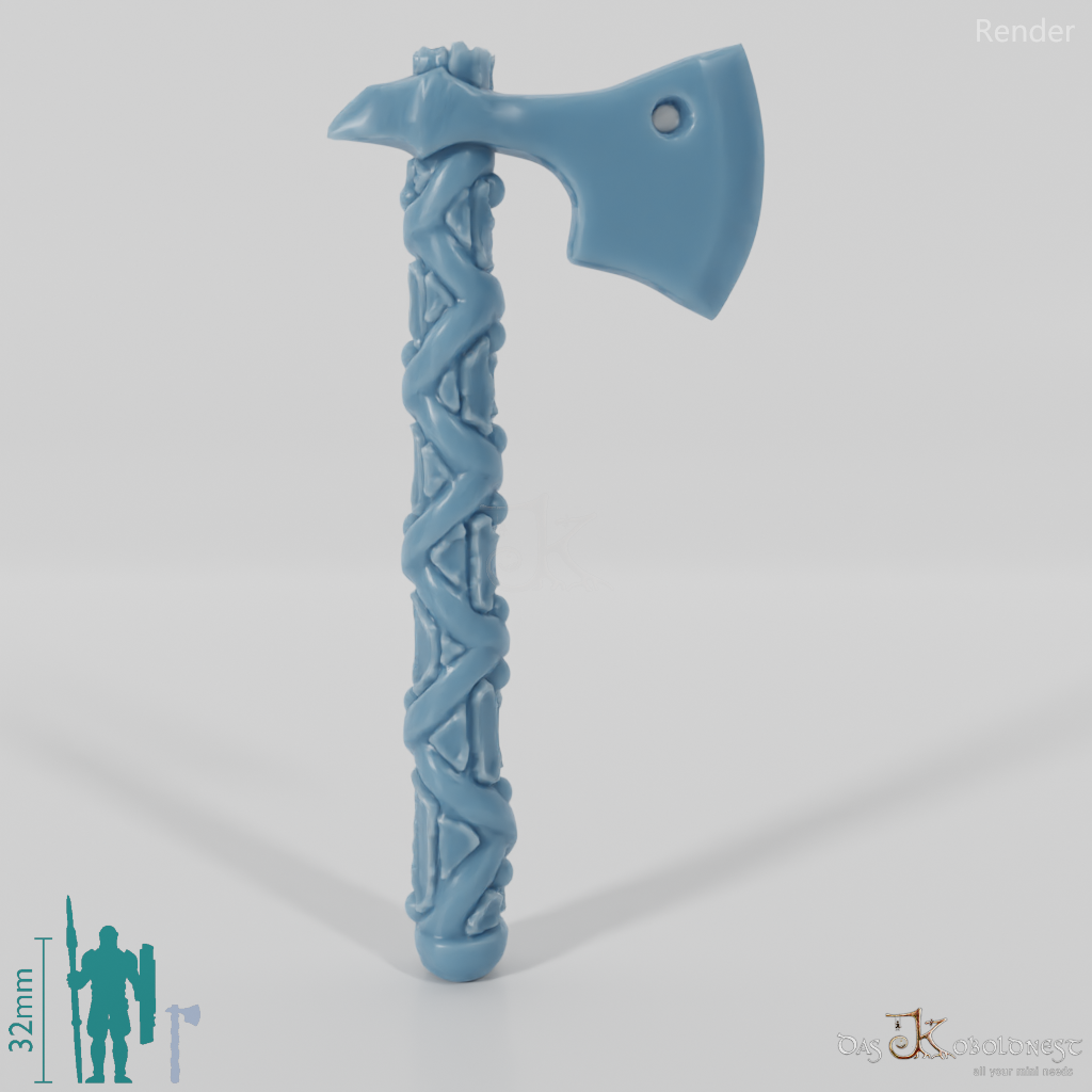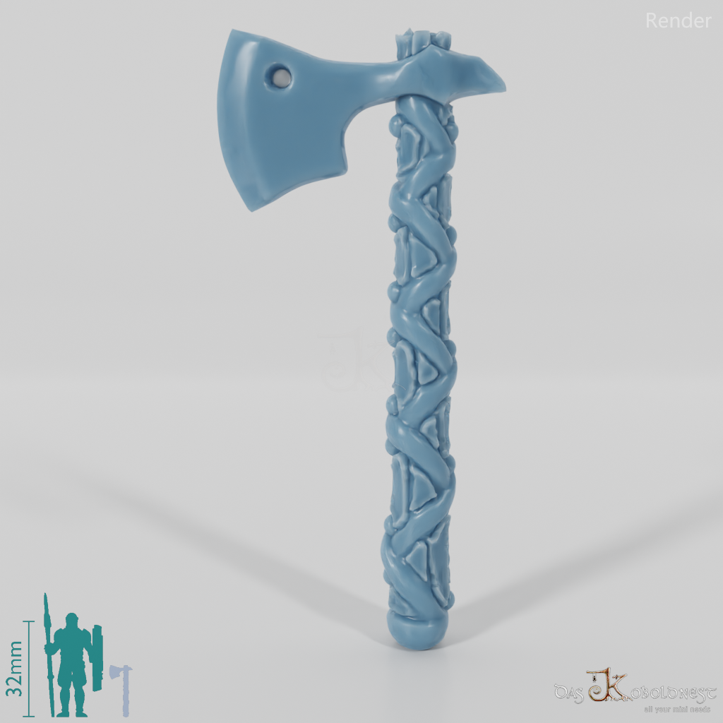 Einhandaxt mit glattem Blatt und stark verziertem Schaft. Die Axt hat eine Länge von ca. 17,3 mm.