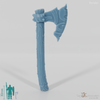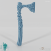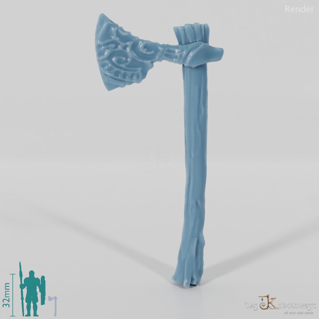 Einhandaxt mit grobem Holzstiel und verziertem Blatt. Die Axt hat eine Länge von ca. 15,7 mm.
