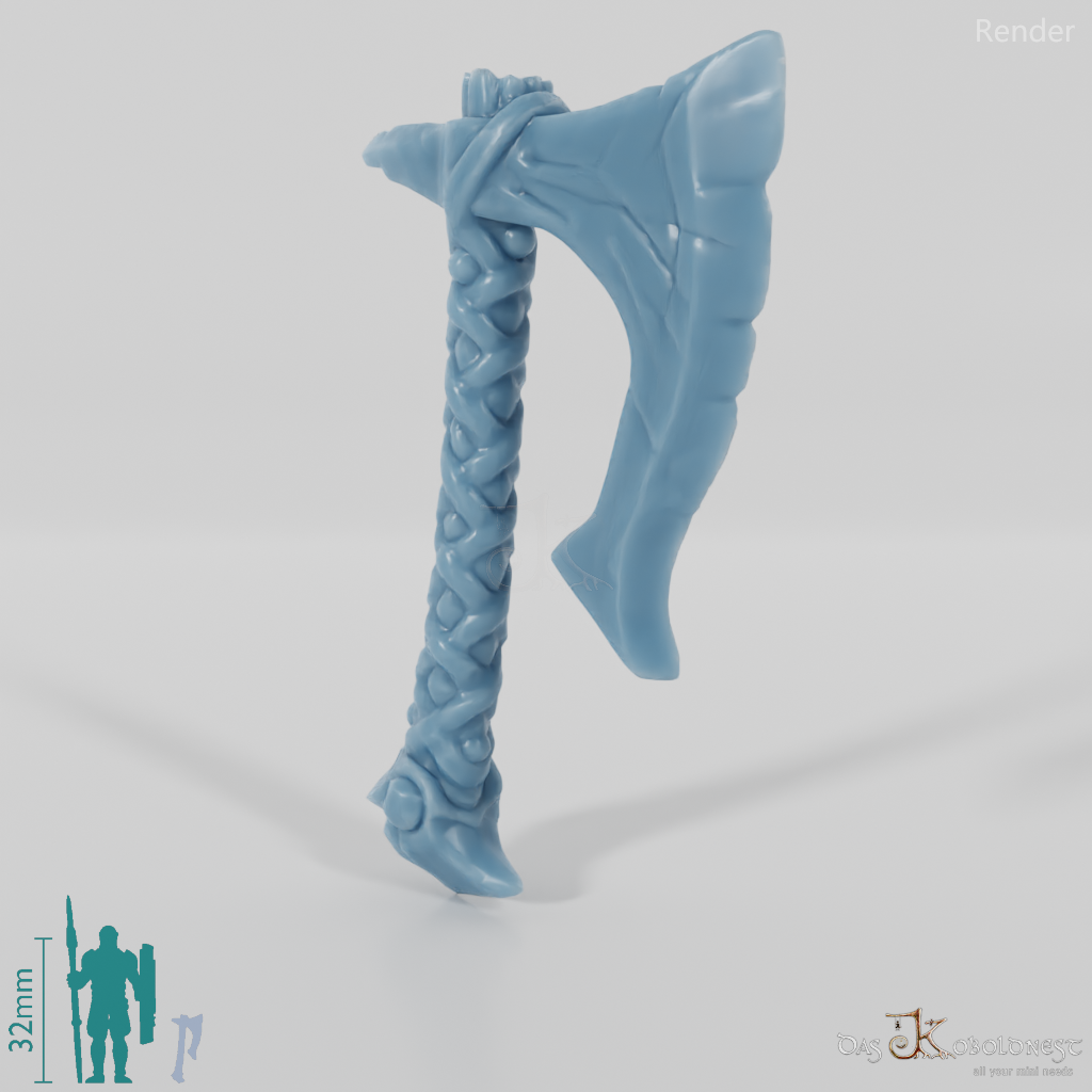 Einhandaxt mit zerfurchtem, langgezogenem Blatt und gewickeltem Holzstiel. Die Axt hat eine Länge von ca. 15 mm.