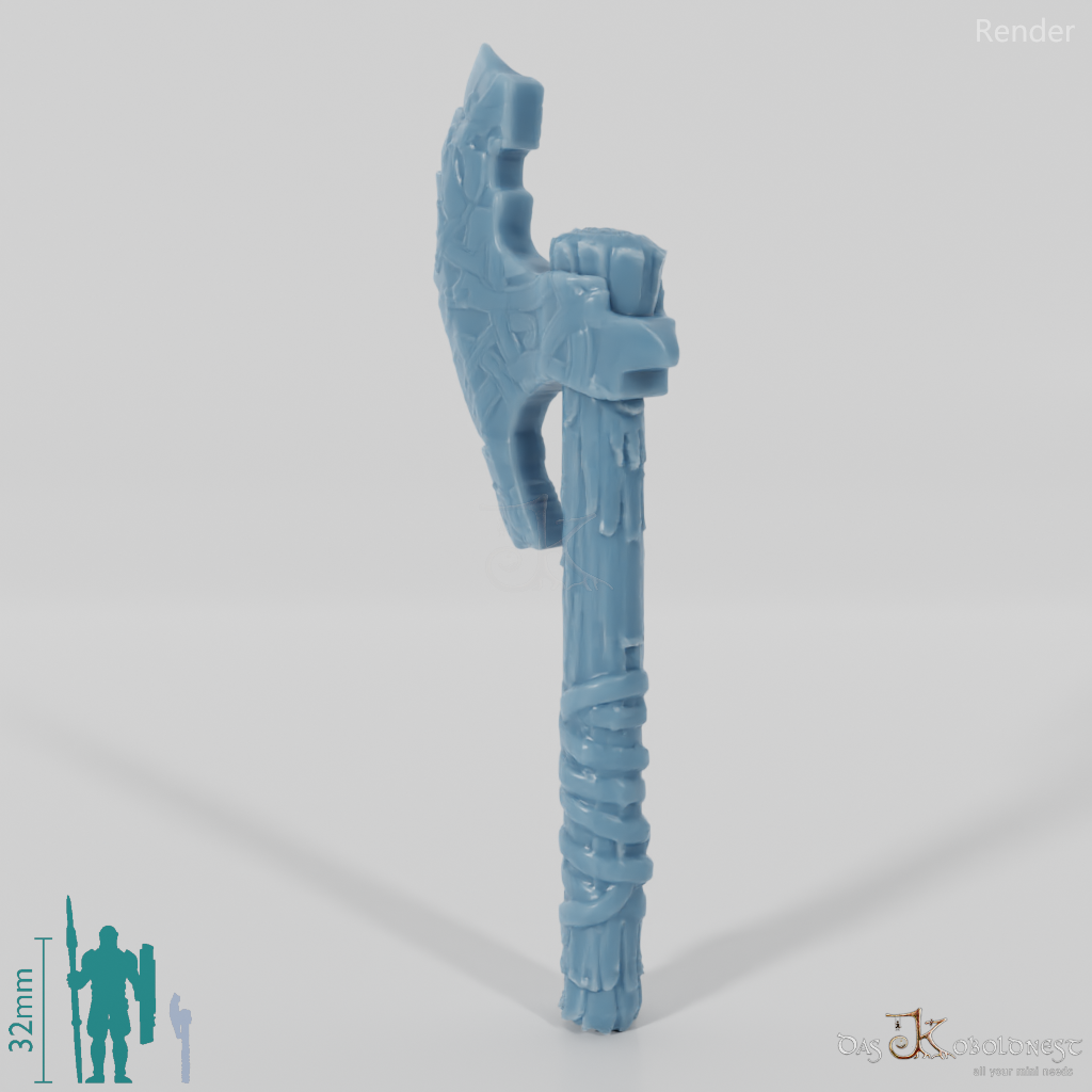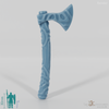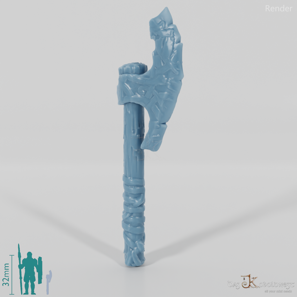 Verzierte Einhandaxt mit schartigem Blatt und teils gewickeltem Holzstiel
