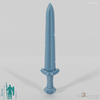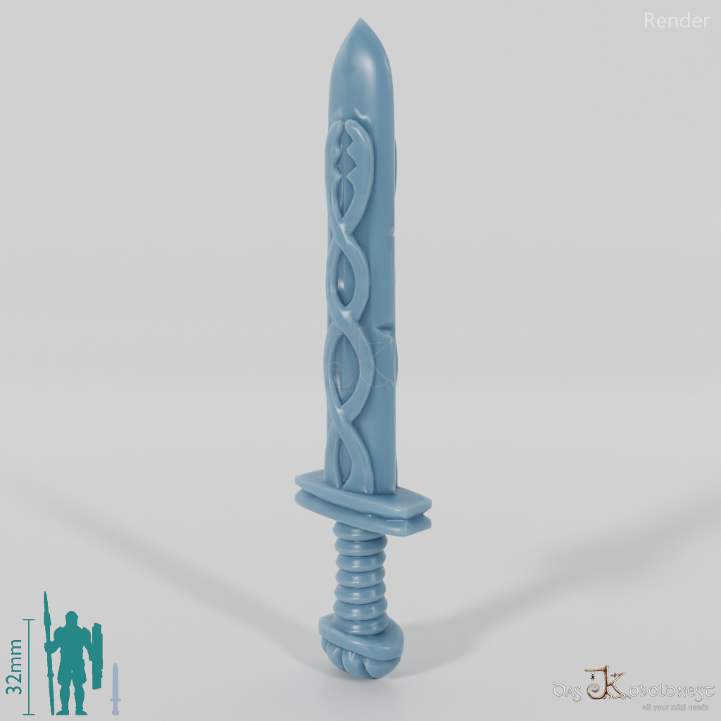 Einhandschwert mit Verzierungen auf der Klinge, gerader Parierstange und gewickeltem Griff. Das Schwert hat eine Länge von ca. 17,5 mm.
