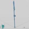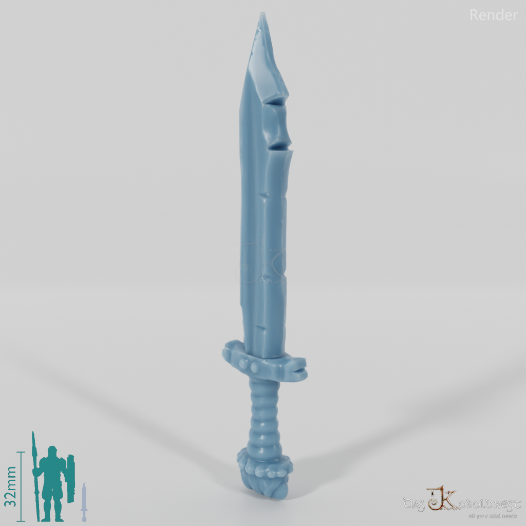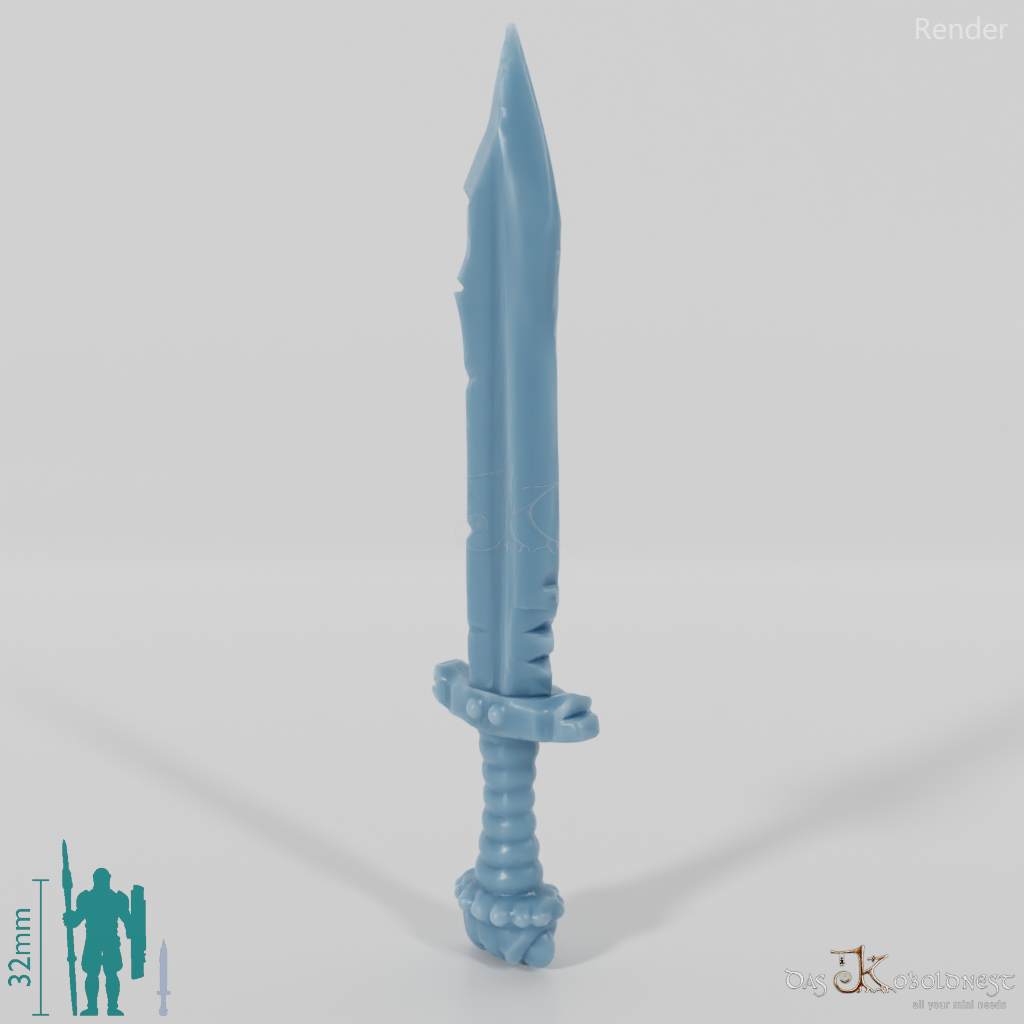 Schartiges Einhandschwert mit gewickeltem Griff. Das Schwert hat eine Länge von ca. 18 mm.