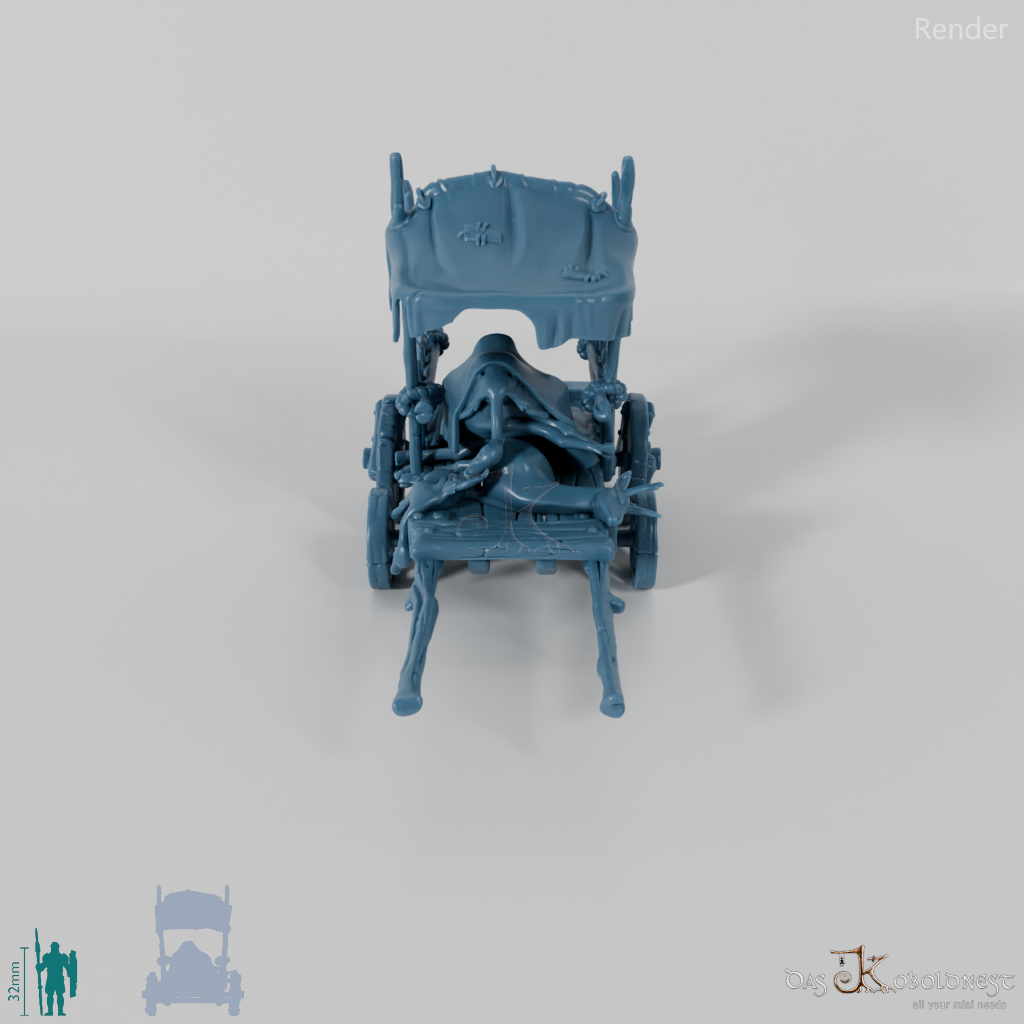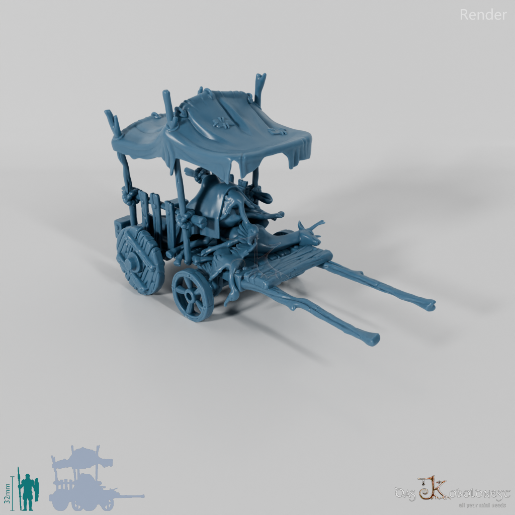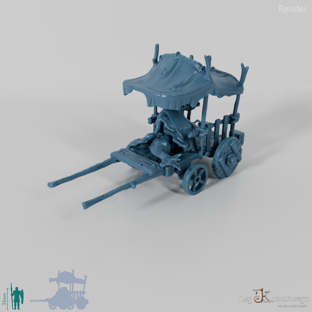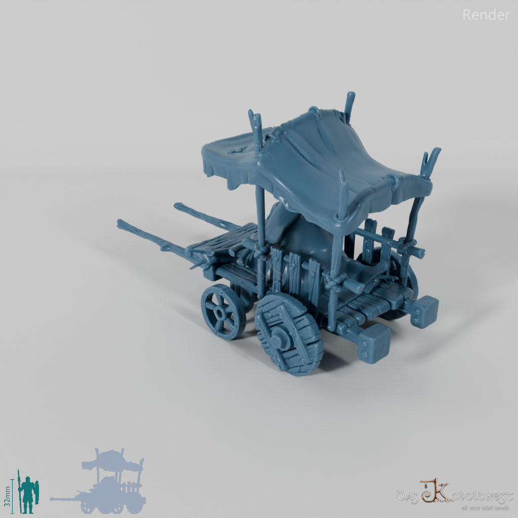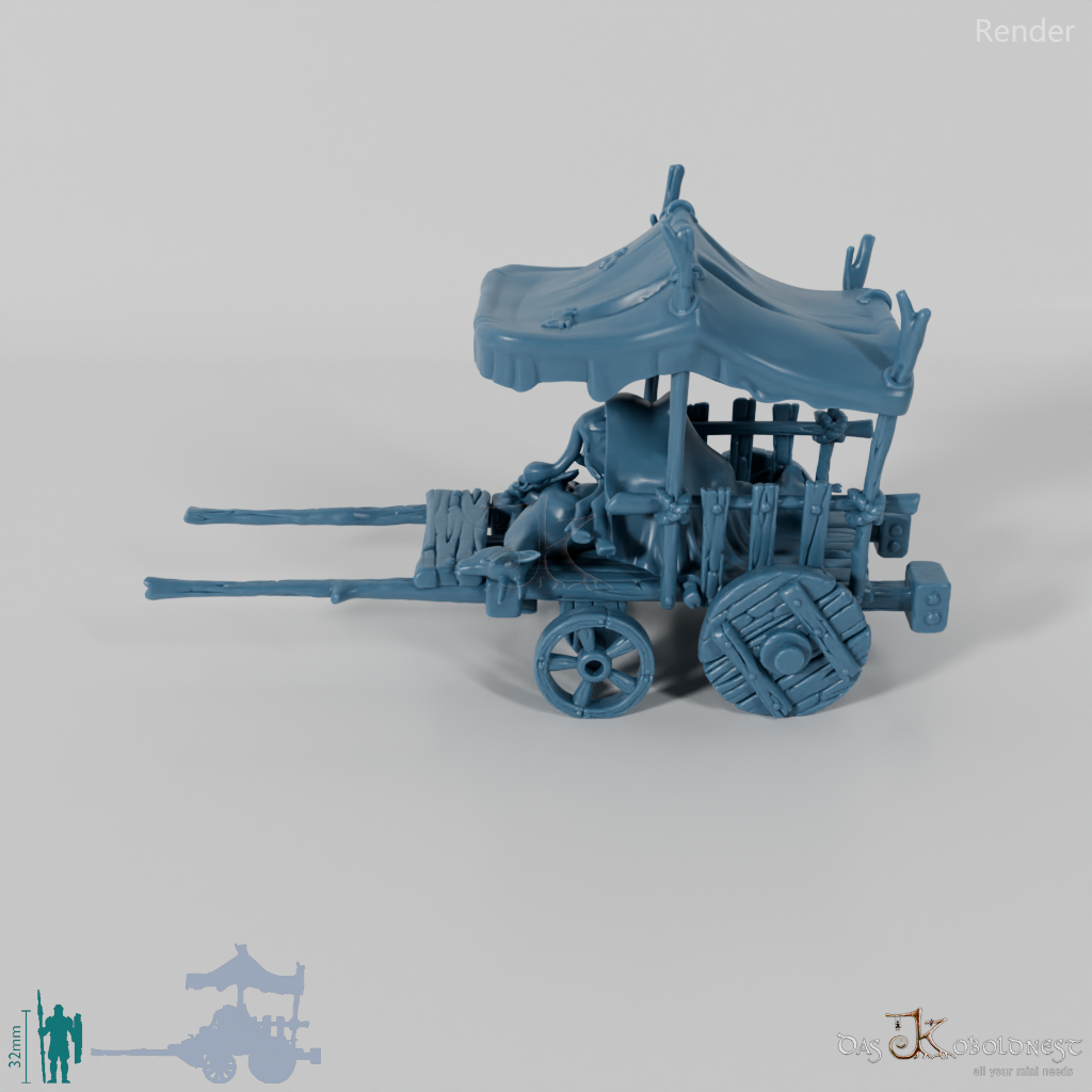 Ein rustikaler, vierrädriger Holzkarren, überdacht mit einem geflickten Tuch, unter dem sich ein Haufen erlegter Tiere verbirgt. Eine ideale Ergänzung für jede ländliche Szene oder für den Transport frischer Beute nach einem erfolgreichen Jagdausflug.