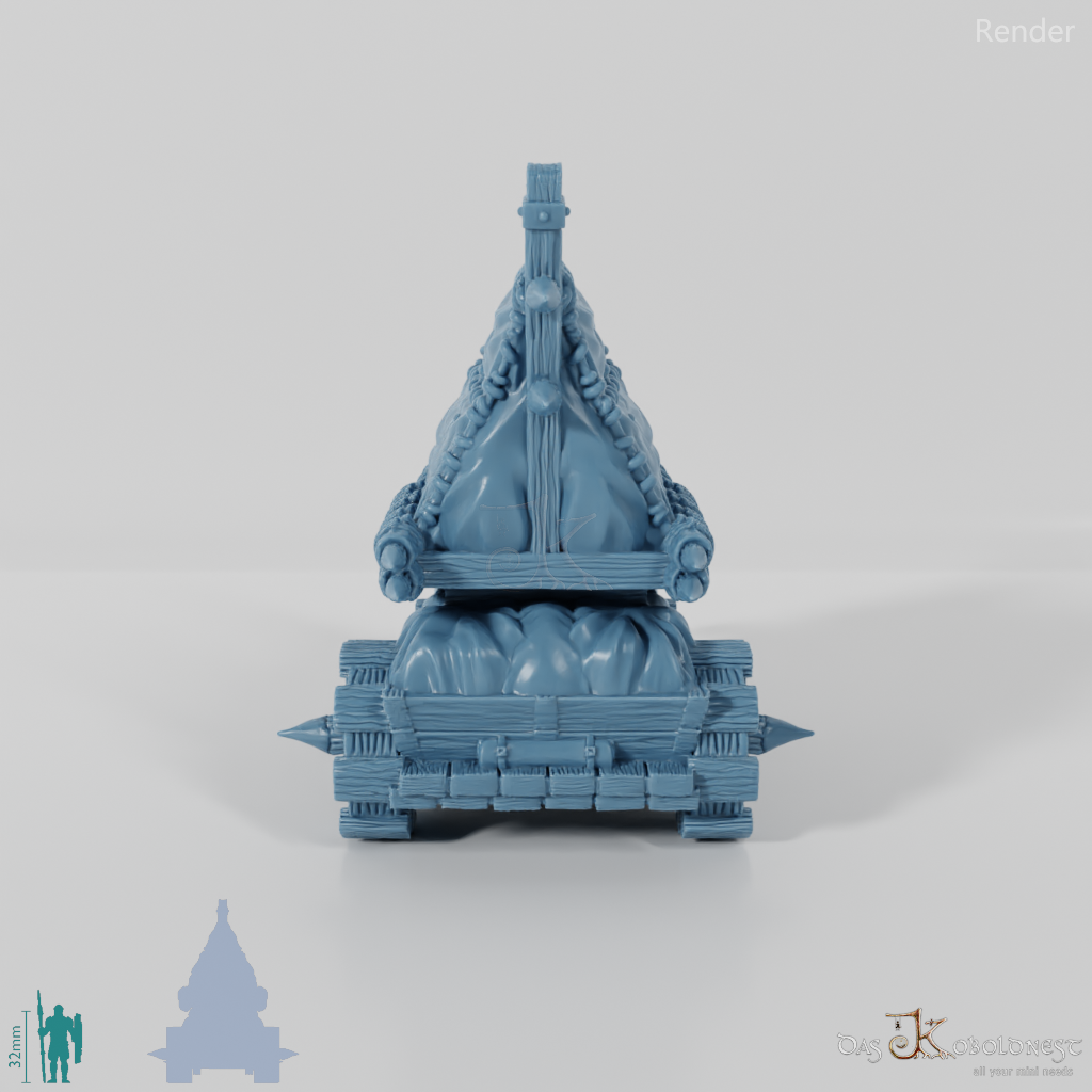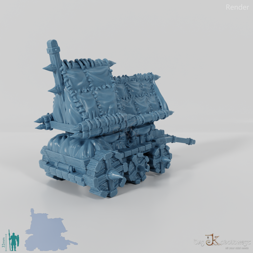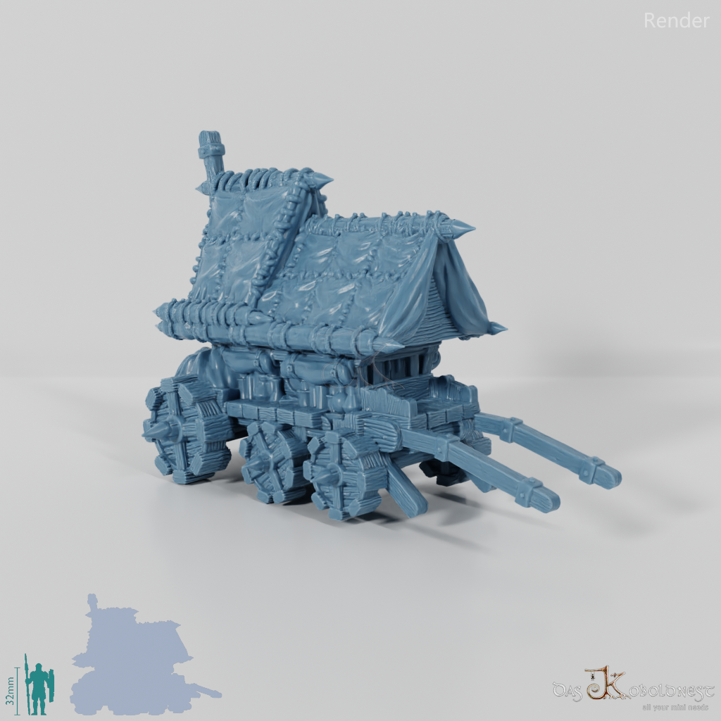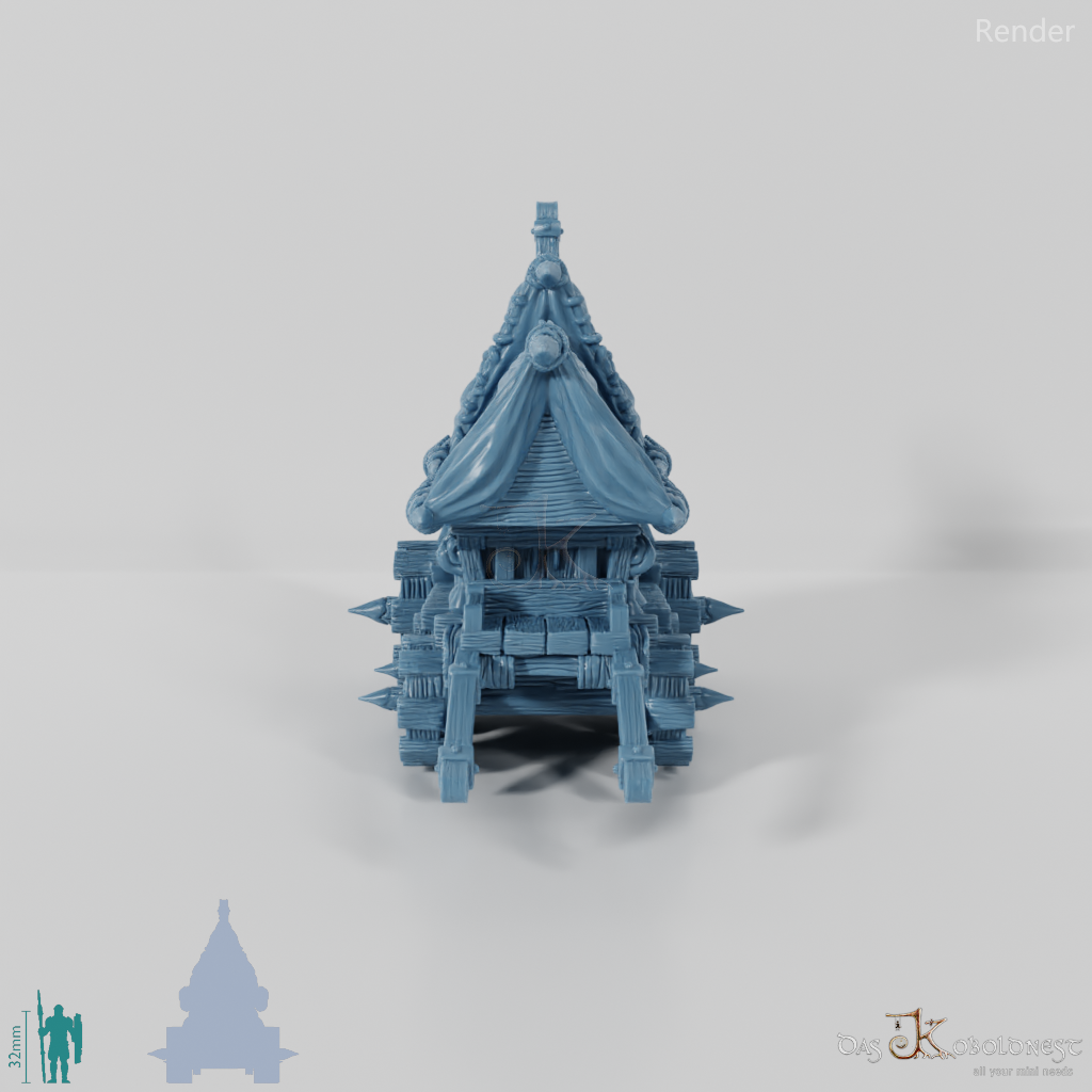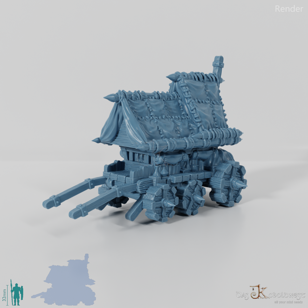 Massiver Holzkarren mit sechs Rädern. An den Seiten sind Tränke ausgestellt, das abnehmbare Dach besteht aus angespitzten Holzpfählen und grob zusammengenähten Stoffstücken.