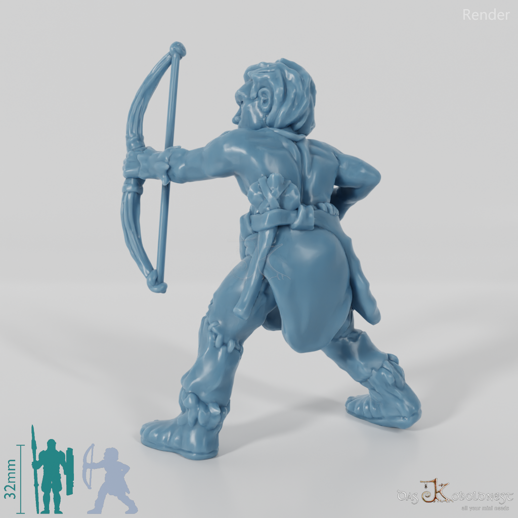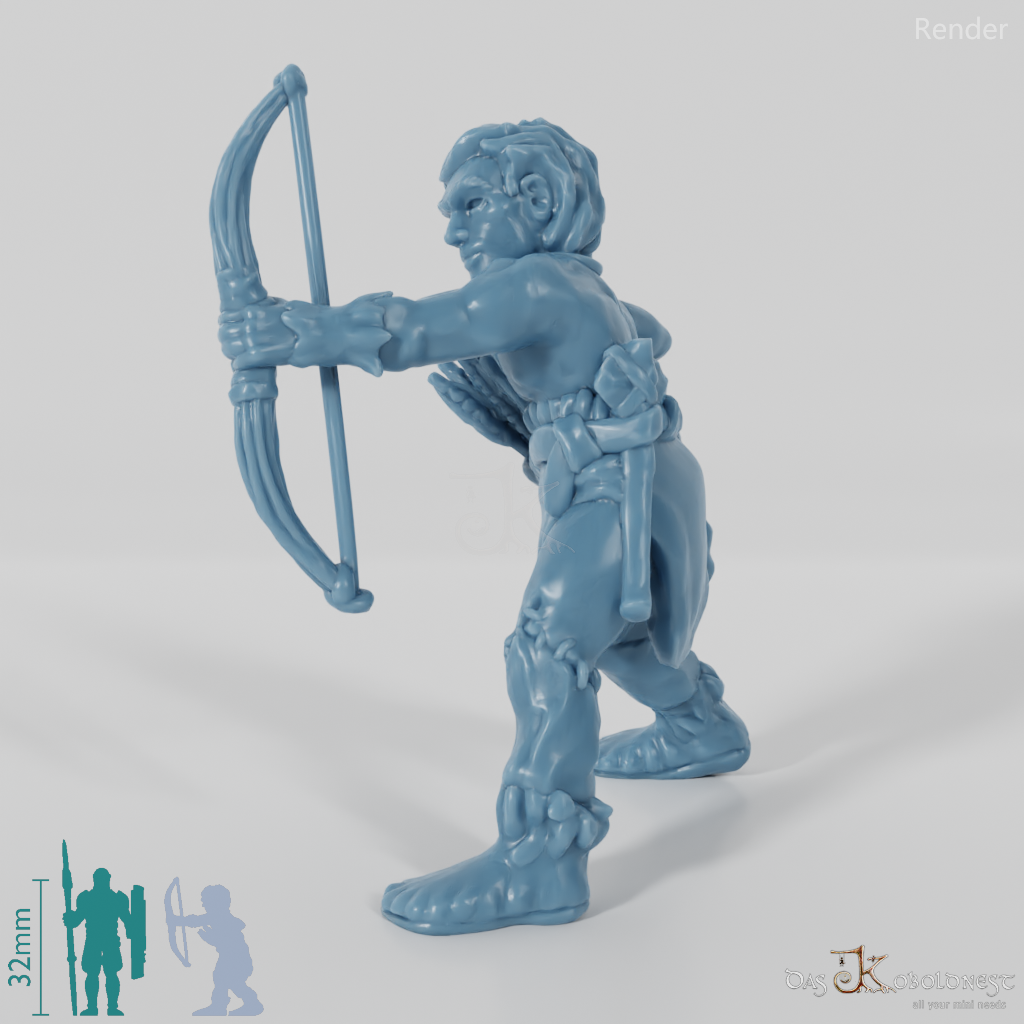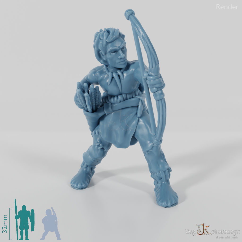 Oberkörperfreier Bogenschütze mit grob genähter Lederhose und Lederschuhen und Pfeilköcher am Gürtel.