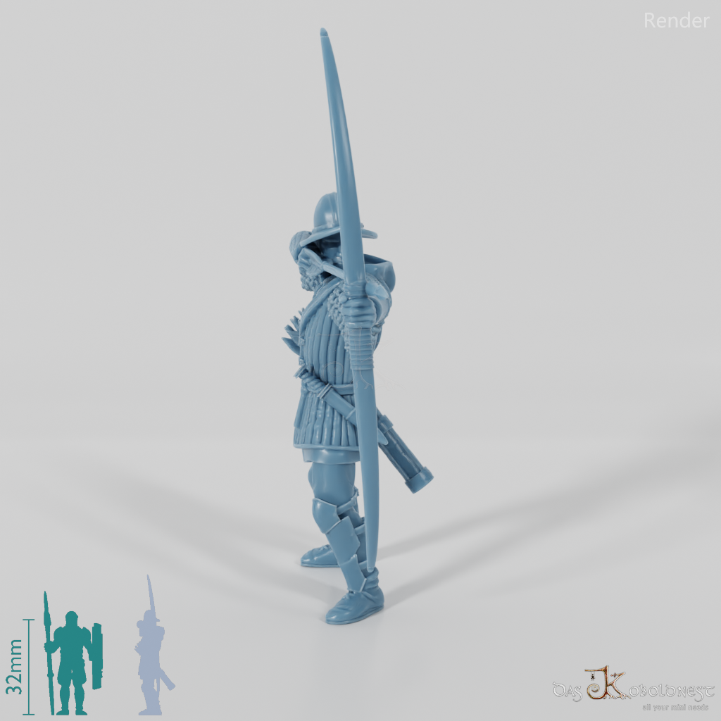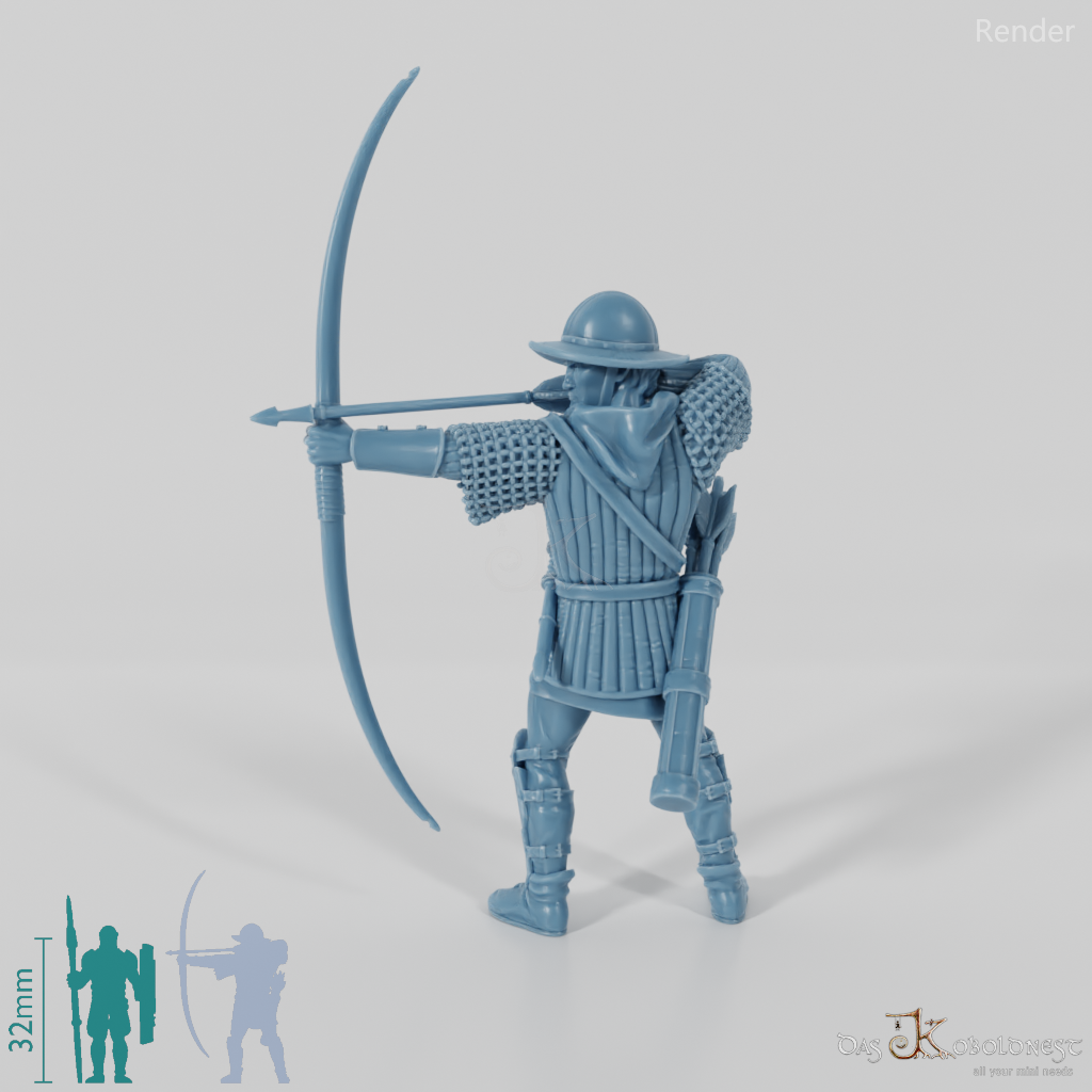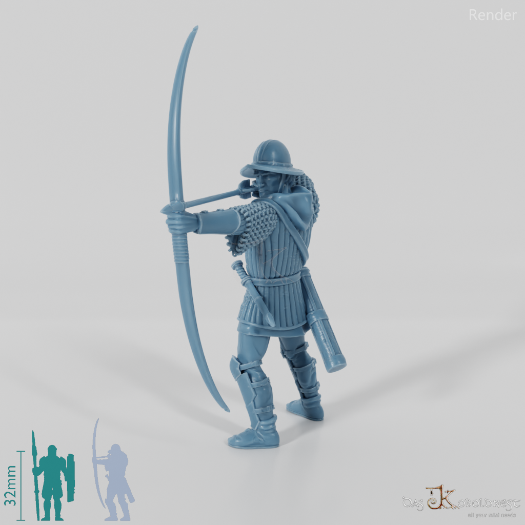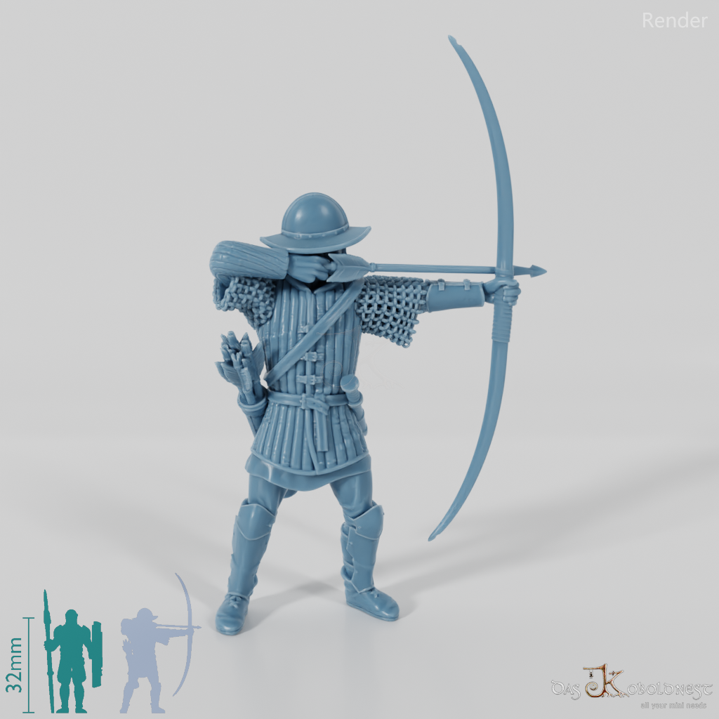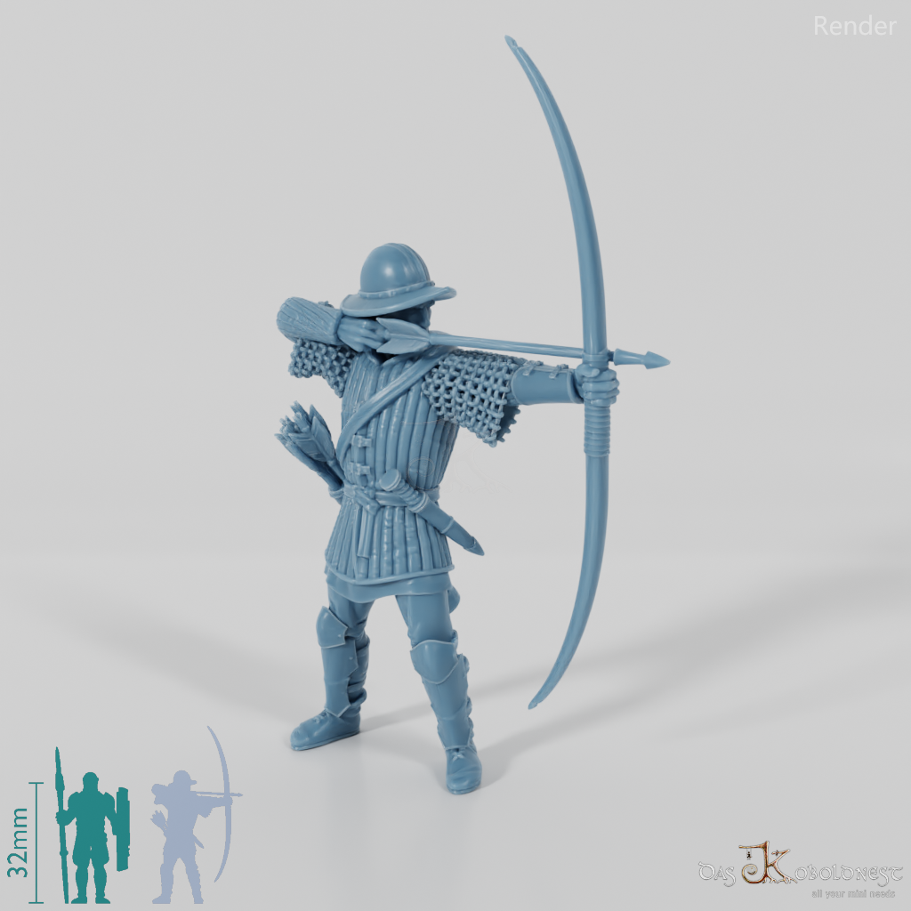 Soldat mit Gambeson und Plattenrüstung, der mit einem Langbogen bewaffnet ist