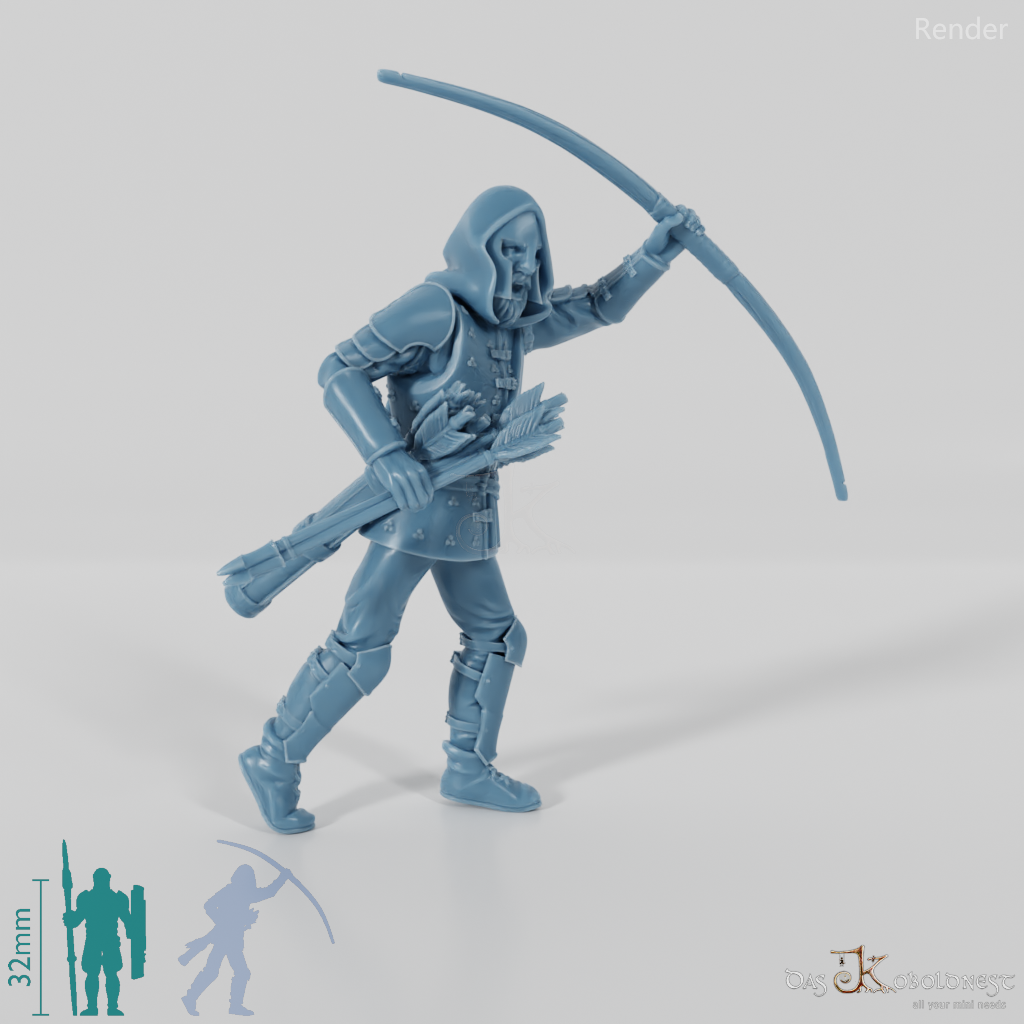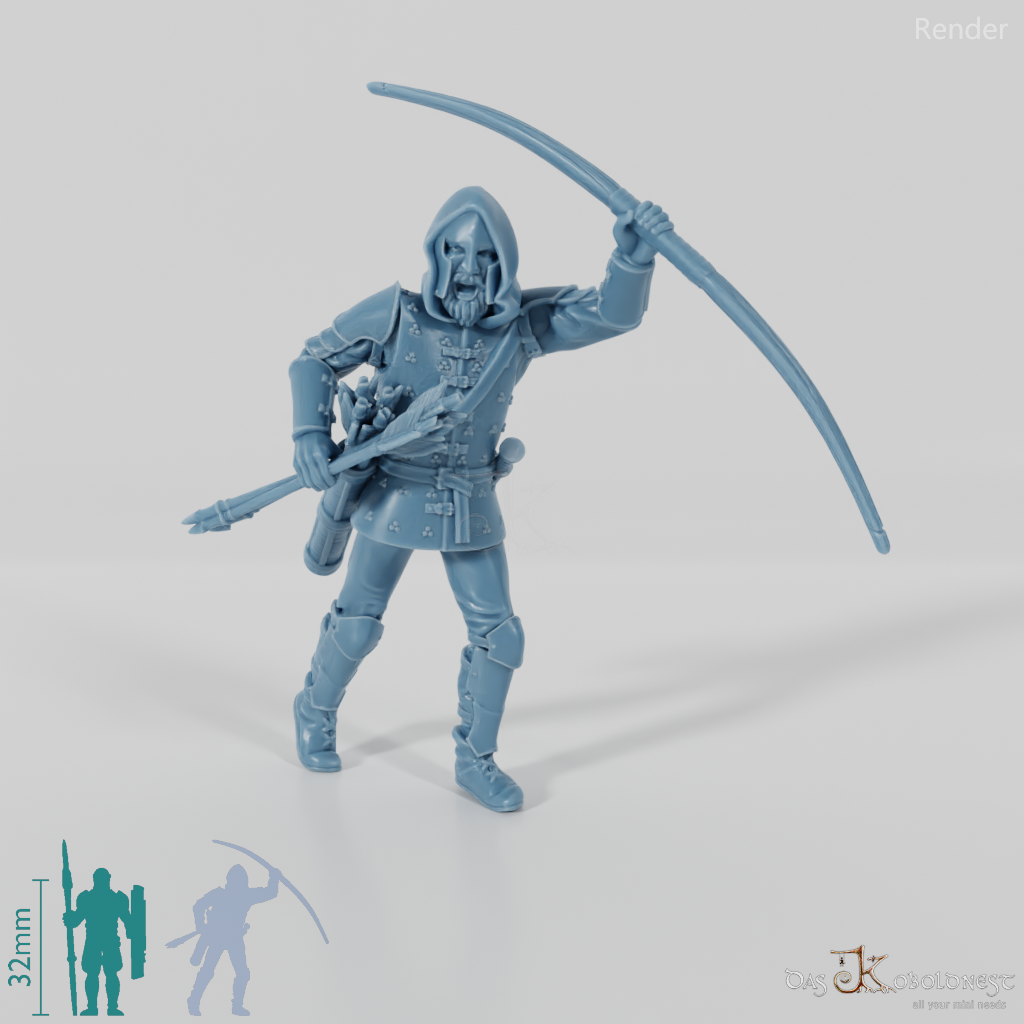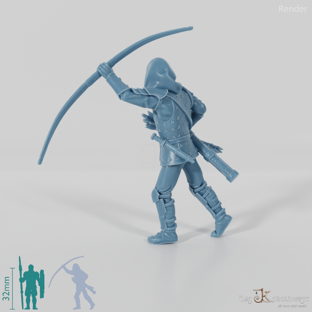 Soldat mit Gambeson und Plattenrüstung, der mit einem Langbogen bewaffnet ist