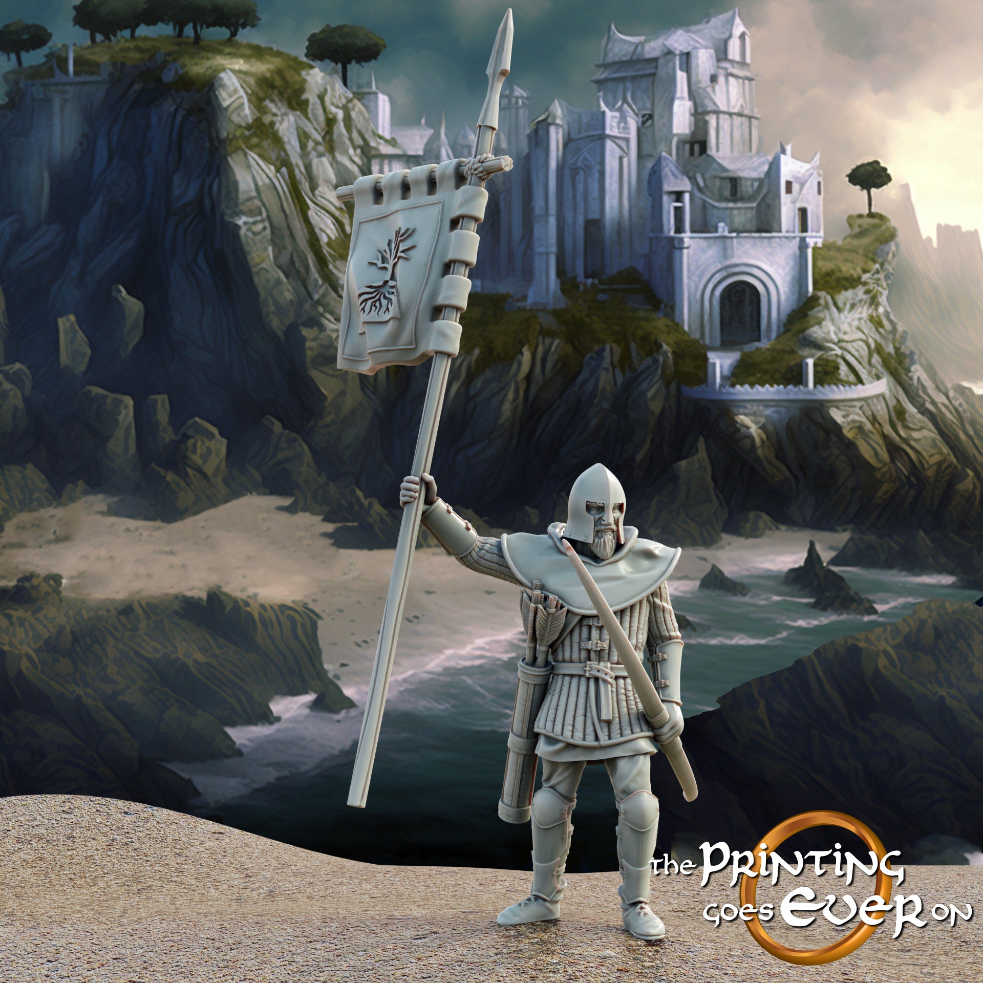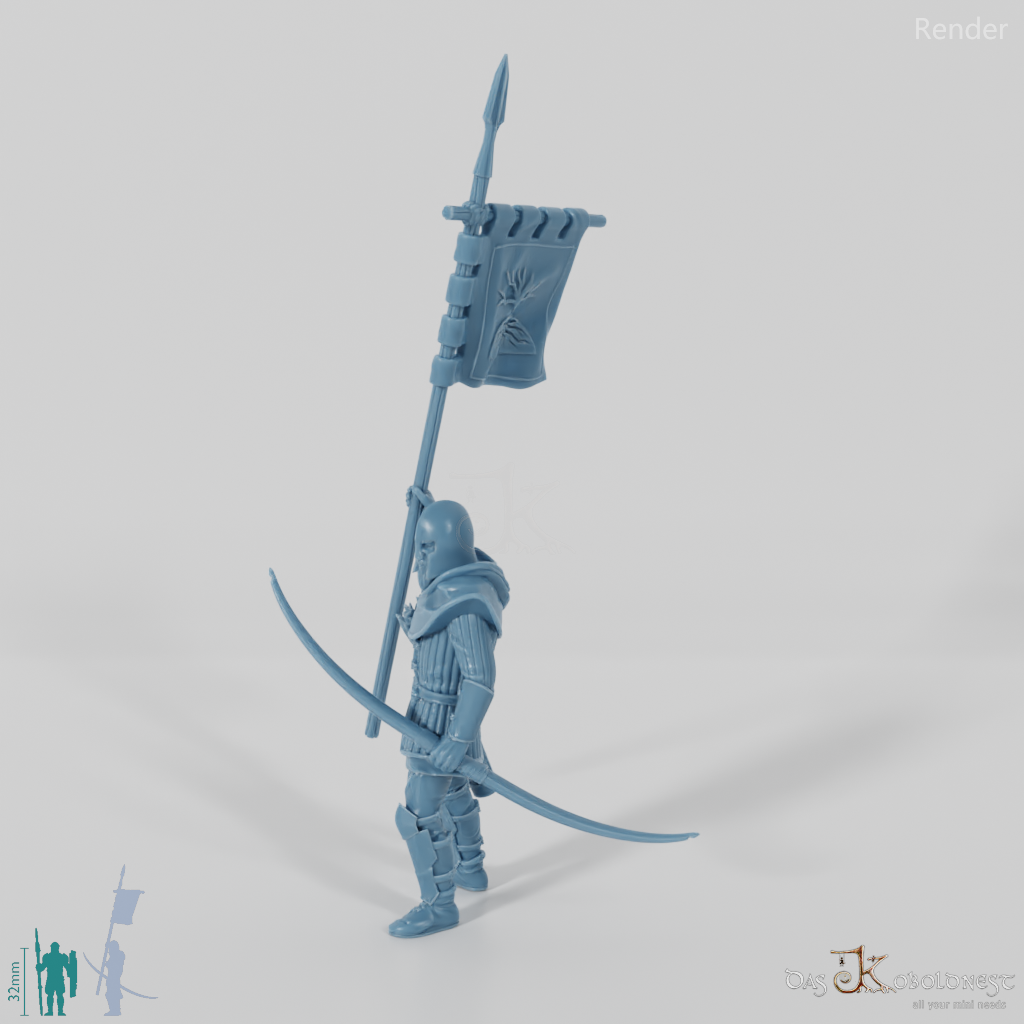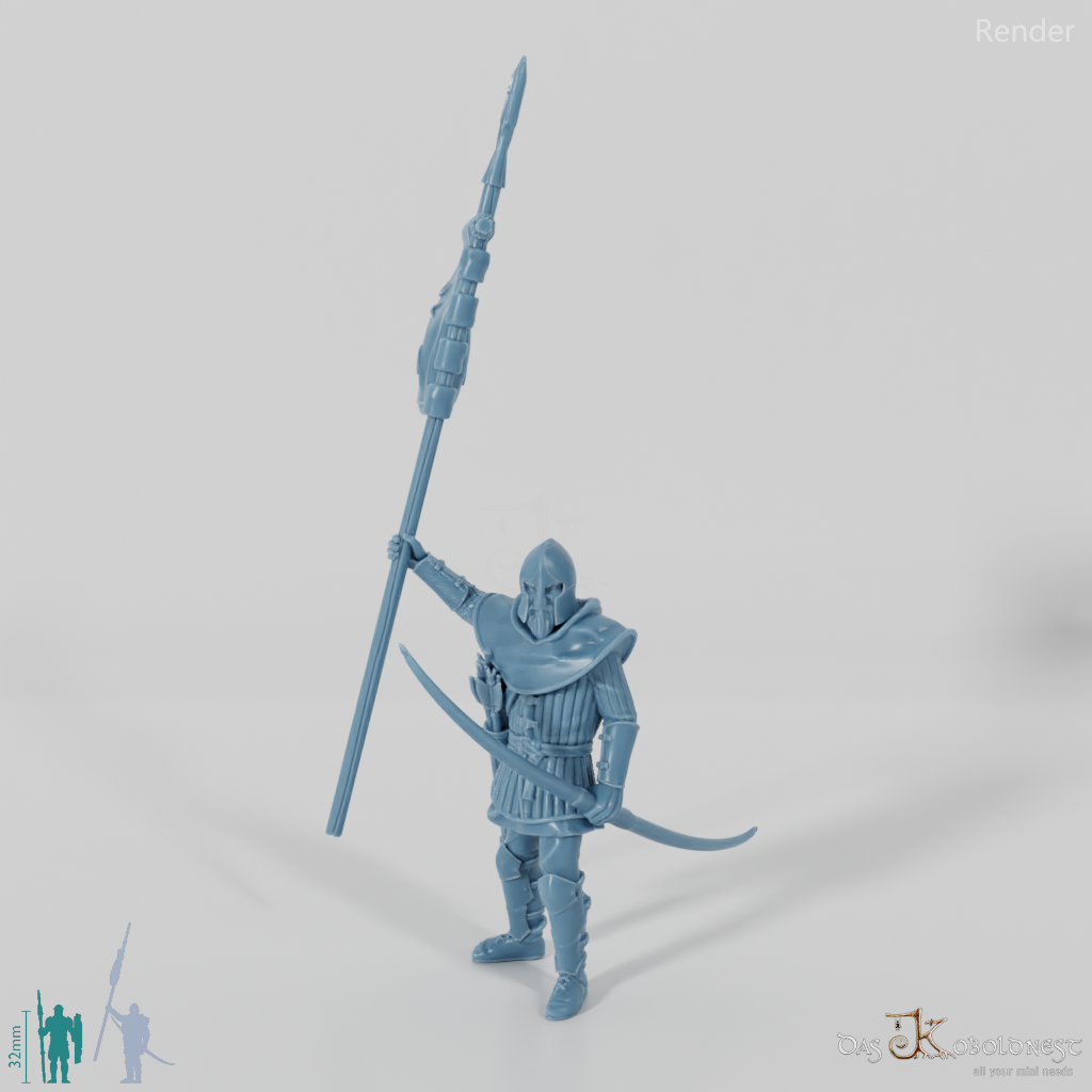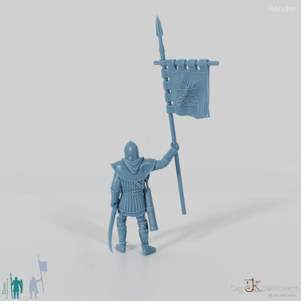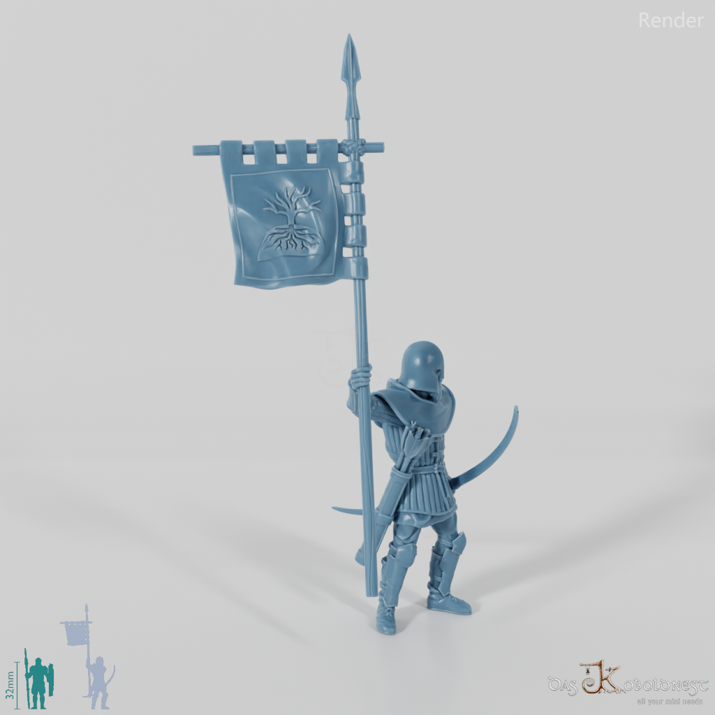 Soldat mit Gambeson und Plattenrüstung, der mit einem Langbogen bewaffnet ist und ein großes Banner mit totem Baum trägt